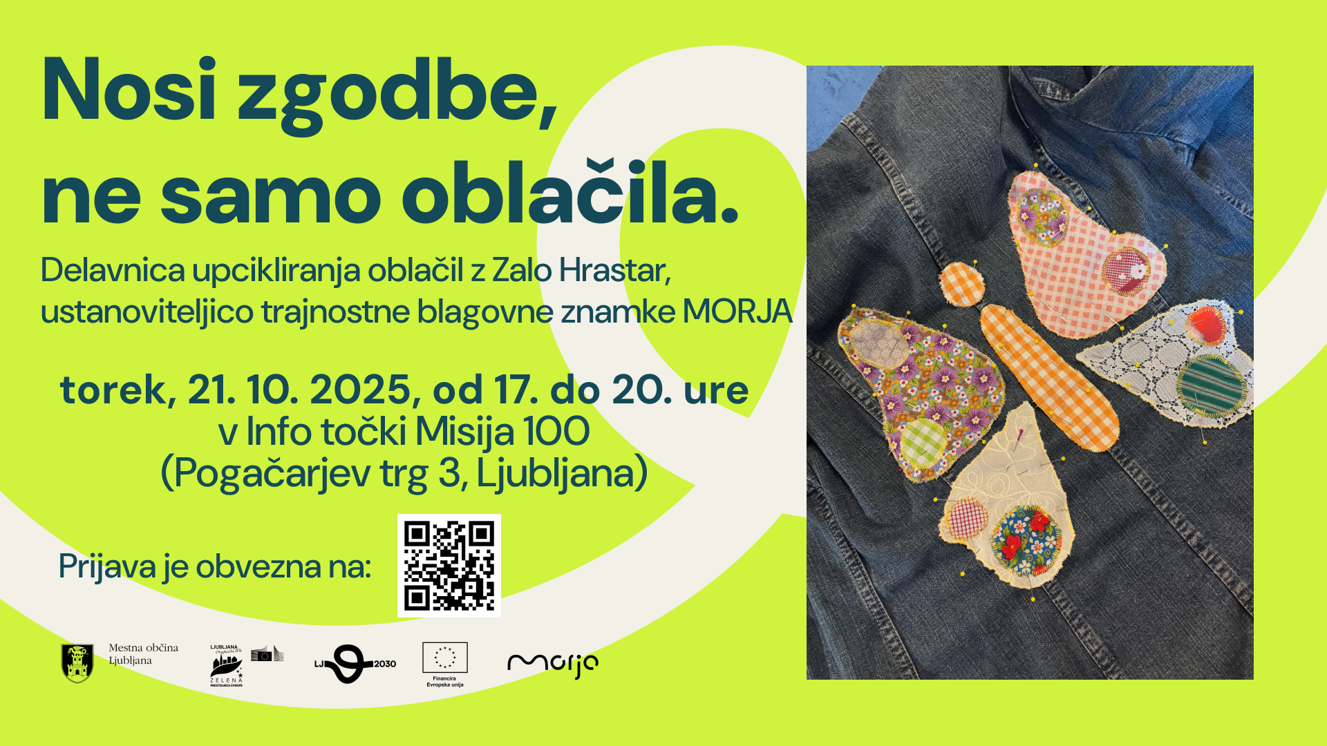 Zala Hrastar, ustanoviteljica blagovne znamke upcikliranih oblačil MORJA, verjame, da je najlepše, ko v življenju cenimo, kar že imamo. Zato pripravlja delavnico upcikliranja oblačil, kjer bo predstavila, kako lahko prenovimo svoja ‘stara’ oblačila, jim dodamo svoj pečat in novo zgodbo.