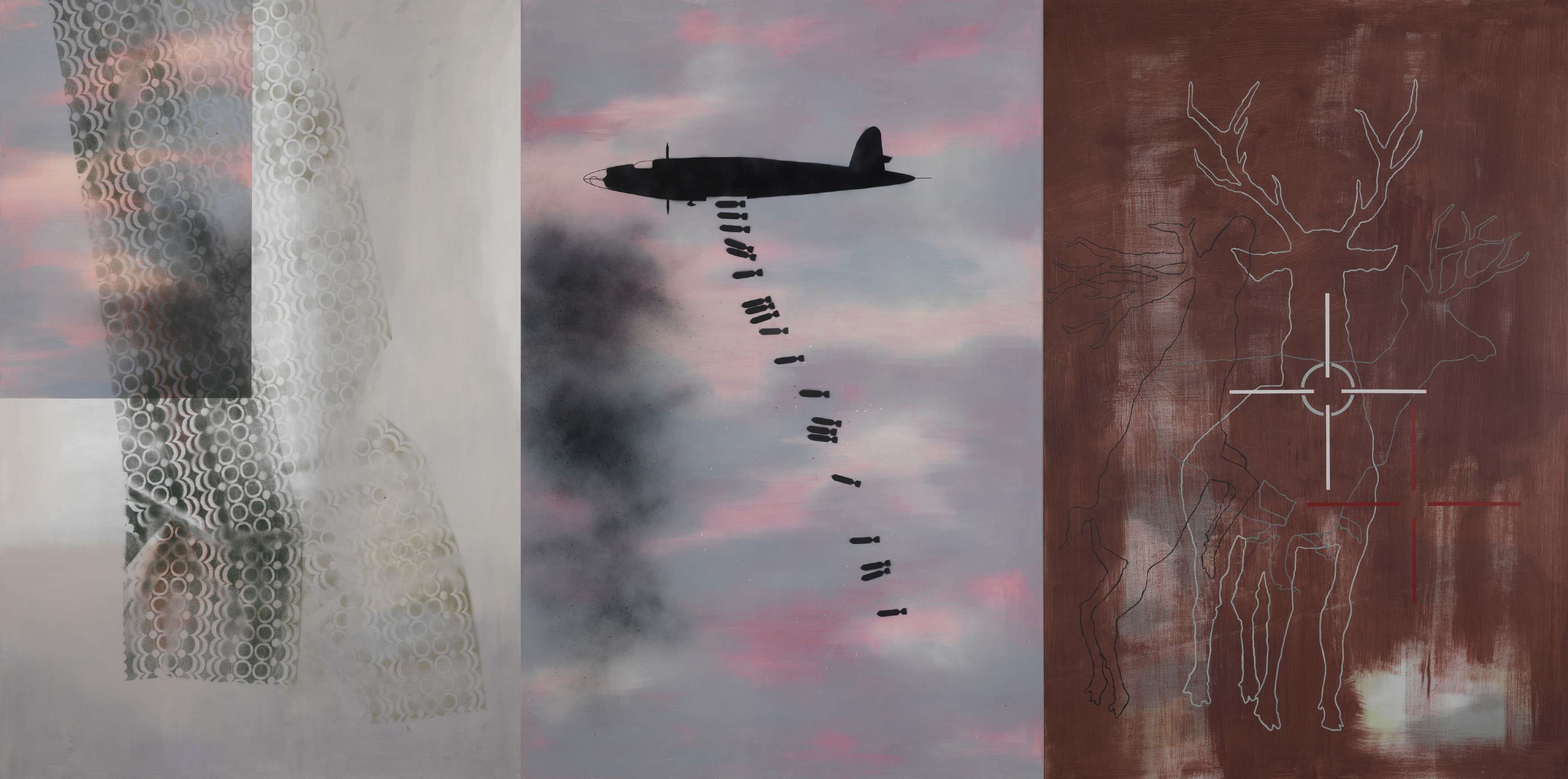 V slikarski seriji se torej umetnica sprašuje o brezbrižnih političnih odločitvah, ki družbe privedejo v stanje konflikta, o nekaterih temeljnih eksistencialnih vprašanjih o sistemskem nasilju in o vlogi posameznika v družbi. Silhueta vojnega letala, ki iz svoje notranjosti spušča bombe v prosti pad, je lahko nedvoumen sinonim totalne vojne, ki ne izbira sredstev za dosego svojih ciljev. Podoba deluje kot protivojni plakat, ki v želji po prebujanju sočutja posega po jasnih in neposrednih sporočilih. Namiguje tudi na odgovornost (tudi) tistega, ki je potegnil ročico za odpiranje lopute, iz katere se vsujejo bombe, četudi morda to ni bila osebna odločitev, ampak zgolj izpolnjevanje ukaza.