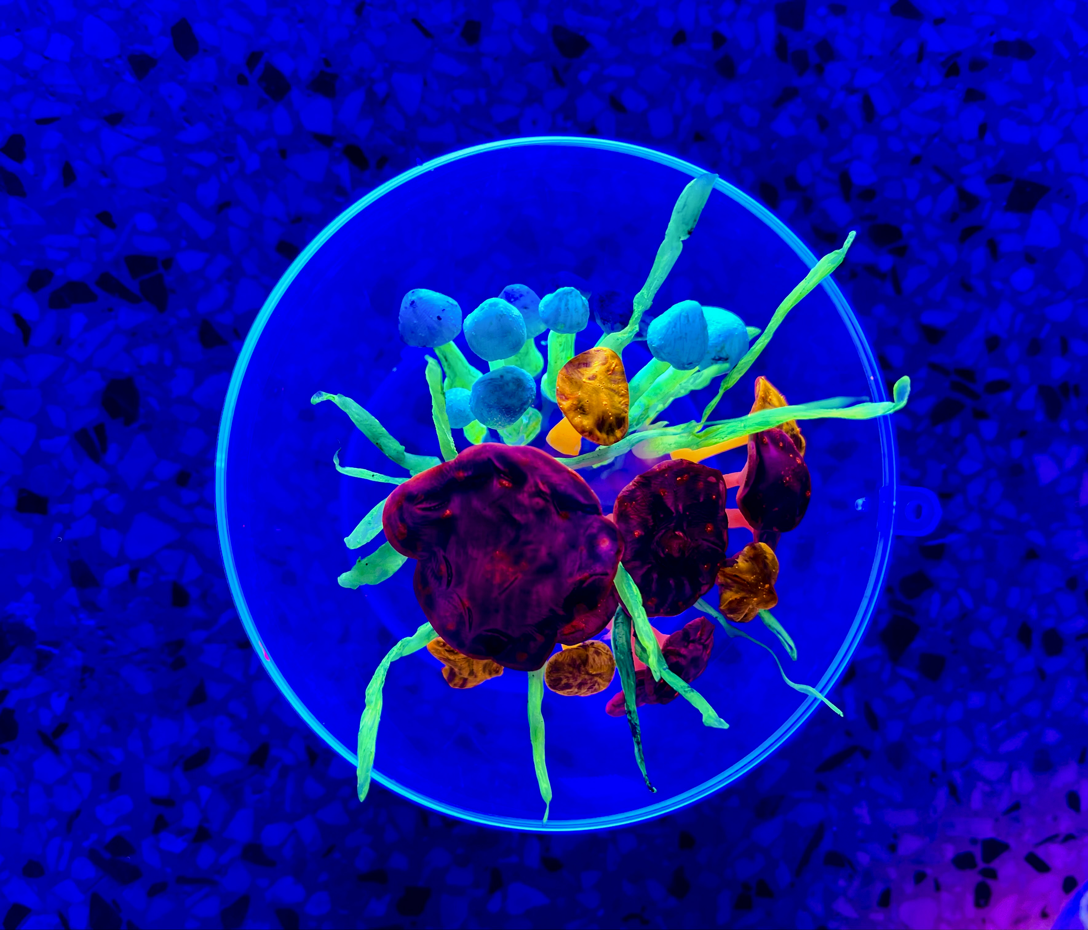 Na povabilo Pionirskega doma je mikologinja Katarina Grabnar Apostolides udeleženke tečaja kiparstva za odrasle popeljala v večerni gozd. S pomočjo UV svetilk so raziskovale barve in oblike, ki so se pojavljale pred njimi. To izkušnjo so prevedle v likovno vizualne vtise – v lebdeče prozorne krogle so ujele majhne mikološke ekosisteme, ki žarijo pod UV svetilkami.