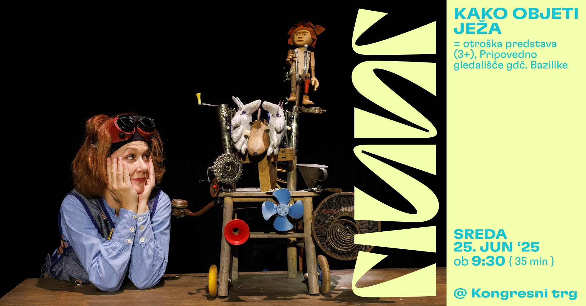 Uprizoritev nas povabi v delavnico gdč. Bazilike, iz katere zmeraj prihajajo čudežne pripovedi, nikoli pa še nismo imeli možnosti pokukati vanjo. Tokrat nam je to dovoljeno. In pred nami se razpre svet, kjer iz recikliranih predmetov in materialov pred našimi očmi nastajajo lutke, ki nato oživijo in nas povabijo v zgodbo Jane Bauer, Kako objeti ježa. Delavnica gdč. Bazilike je prostor neomejene domišljije. Iz zavrženih predmetov in iz delavničnega orodja vznikne svet zgodbe o ježu. Delavnica postane gozd, orodje in predmeti pa slon, medved, želva, sraka, šoja ... in jež.