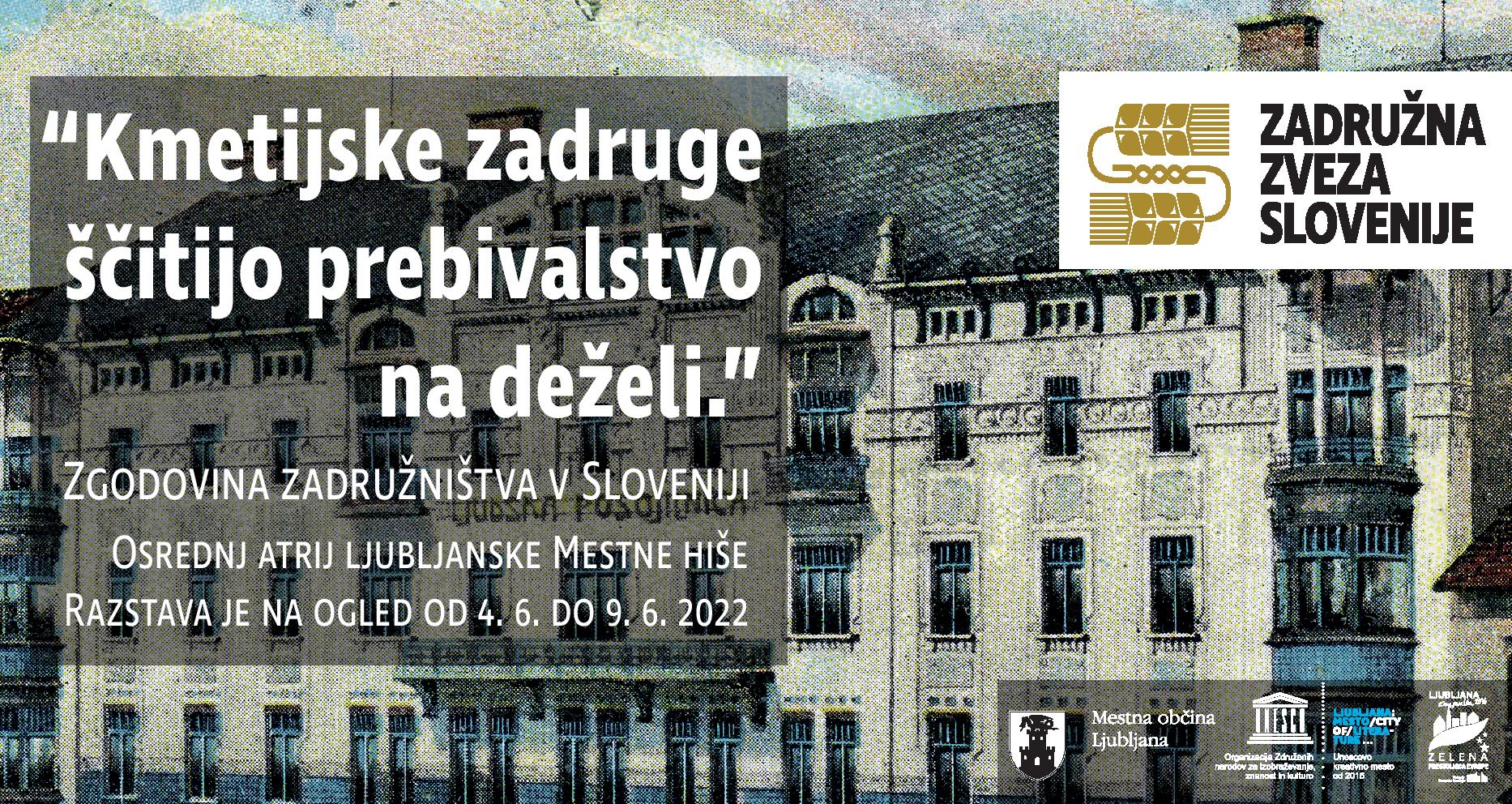 V Osrenjem atriju Mestne hiše bo od 4. do 9. junija 2022 na ogled razstava o zgodovini zadružništva v Sloveniji Kmetijske zadruge ščitijo prebivalstvo v Sloveniji.