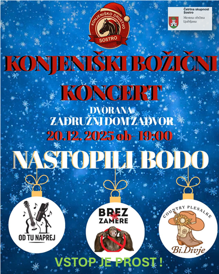 20. decembra ob 19h vas vabimo na Konjeniški božični koncert v dvorano Zadružnega doma Zadvor. Nastopili bodo Od tu naprej, Brez zamere in Bi.Divje.