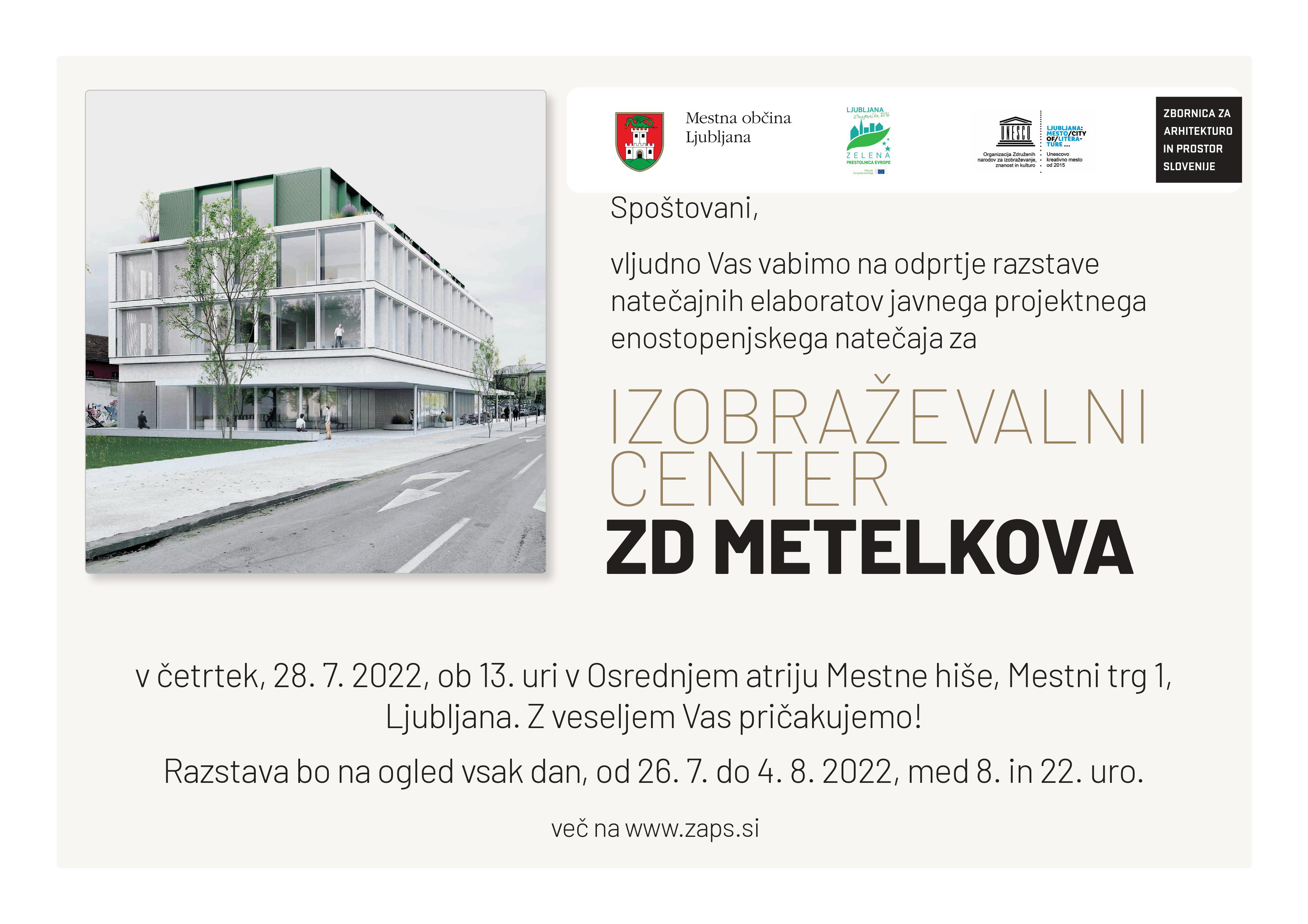V Osrednjem atriju Mestne hiše bo od 26. julija do 4. avgusta 2022 na ogled razgrnitev prispelih in nagrajenih rešitev za Izobraževalni center ZD Metelkova.