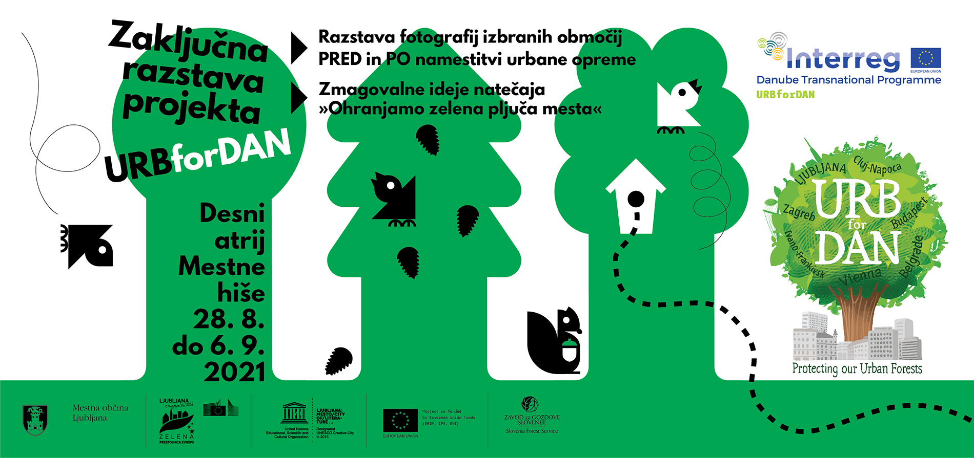 V Desnem atriju Mestne hiše si lahko od 28. avgusta do 6. septembra 2021 ogledate zaključno razstavo URBforDAN – upravljanje in raba mestnih gozdov kot naravne dediščine v podonavskih mestih, na kateri predstavljamo zmagovalne ideje natečaja Ohranjamo zelena pljuča mesta.