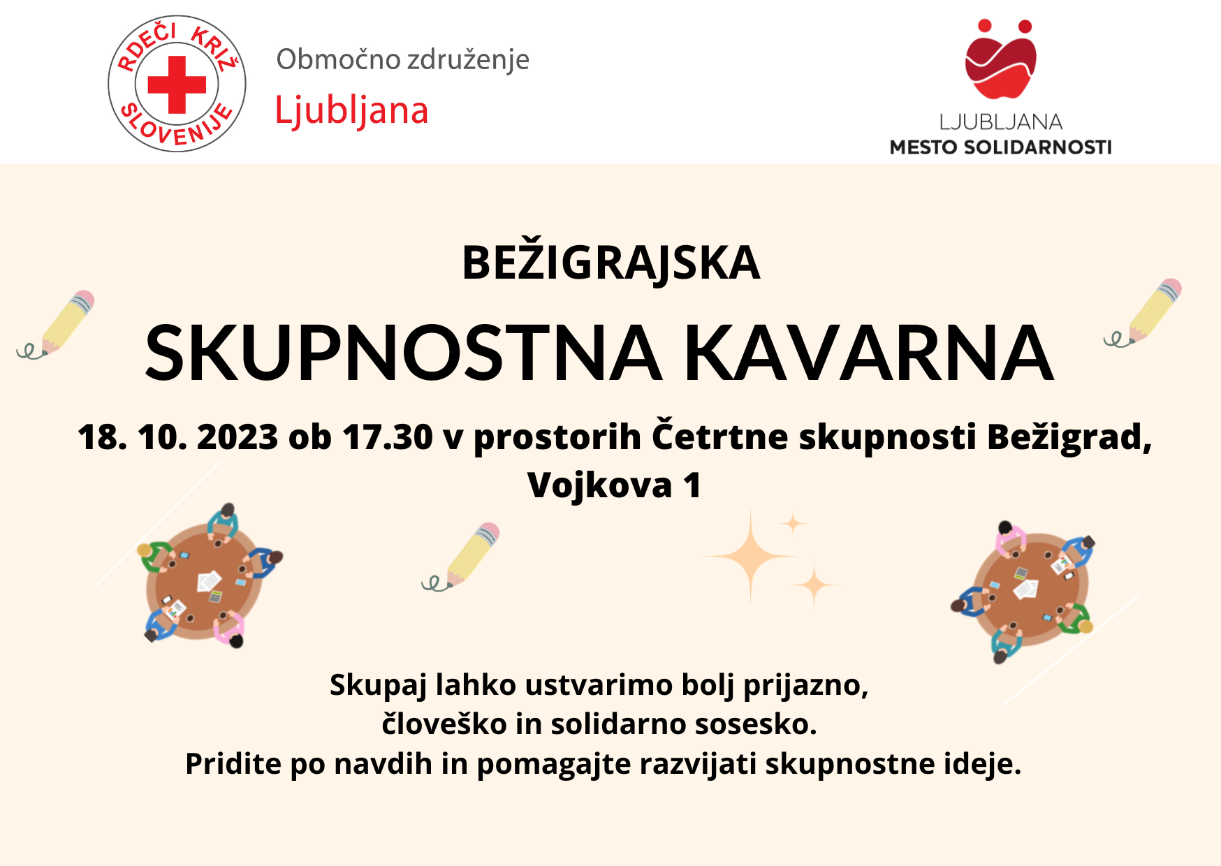 Četrtna skupnost Bežigrad vabi na Bežigrajsko skupnostno kavarno, ki bo v sredo, 18. oktobra 2023, ob 17.30 uri v prostorih ČS Bežigrad na Vojkovi 1.
