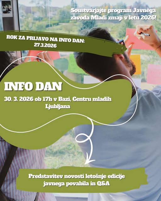 Informativni dan bo potekal 30. marca 2026 ob 17. uri v BAZI, Centru mladih Ljubljana, Ambrožev trg 3, Ljubljana. Trajal bo predvidoma eno uro.