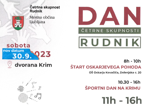 Četrtna skupnost Rudnik obvešča, da je Dan četrtne skupnosti zaradi slabe vremenske napovedi to soboto prestavljen na naslednjo soboto, 30. septembra 2023. Program bo med 11. in 16. uro potekal pred dvorano Krim.