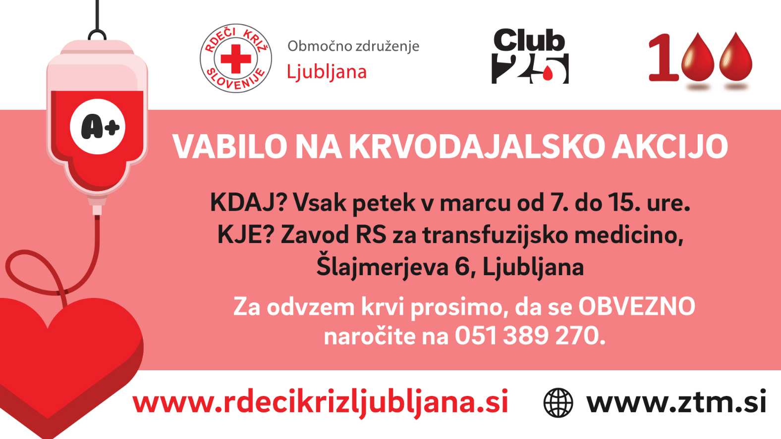 Potrebe po krvi se povečujejo, zato vabljeni, da darujete kri za soljudi. Pokličite 051 389 270, 051 671 147 ali 030 716 796 in se naročite na odvzem, saj je predhodna najava obvezna. Več informacij o pogojih za darovanje na Zavodu RS za transfuzijsko medicino v Ljubljani je na voljo na: www.ztm.si.