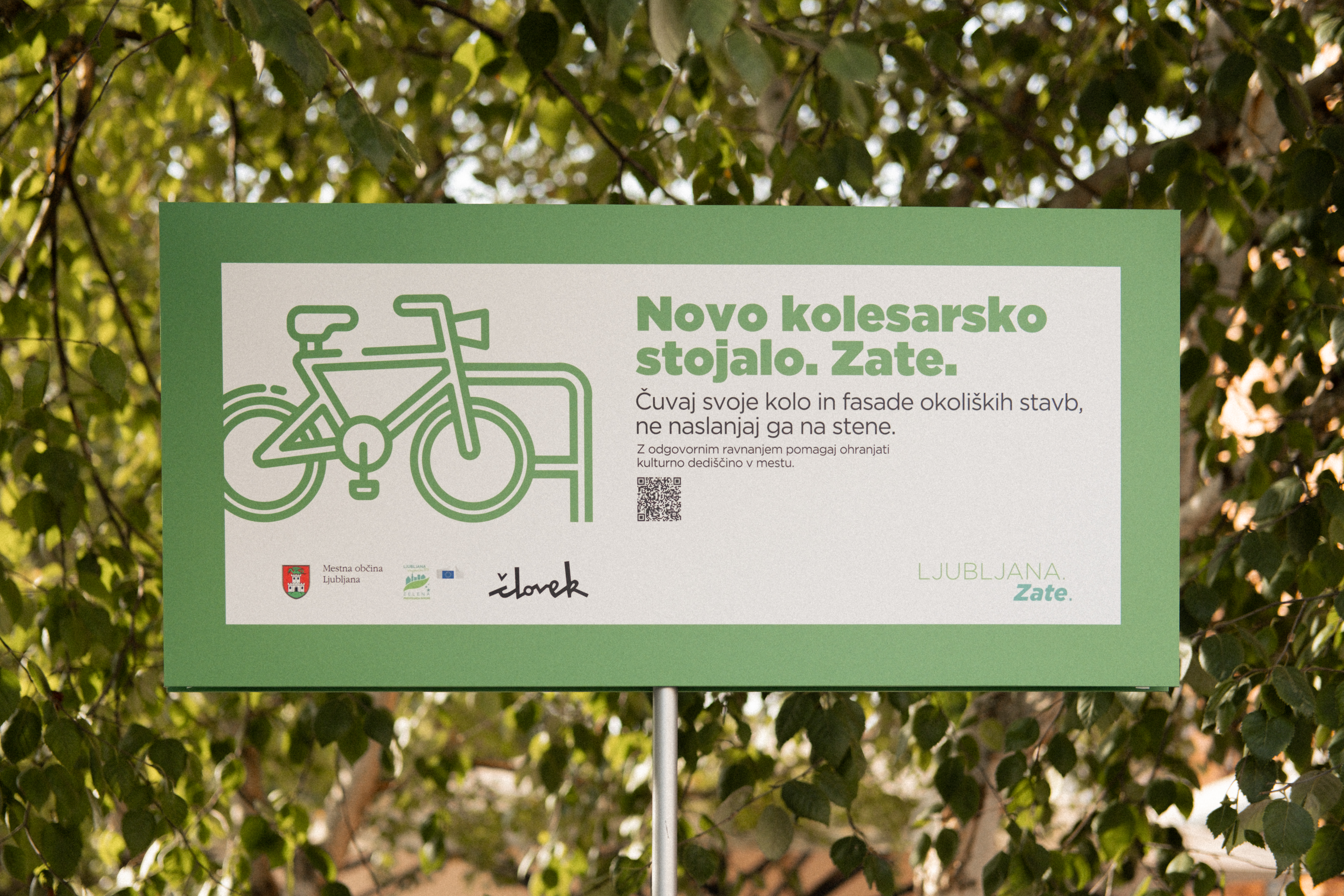 Nova tabla ob novih kolesarskih stojalih na Bregu. Foto: arhiv MOL