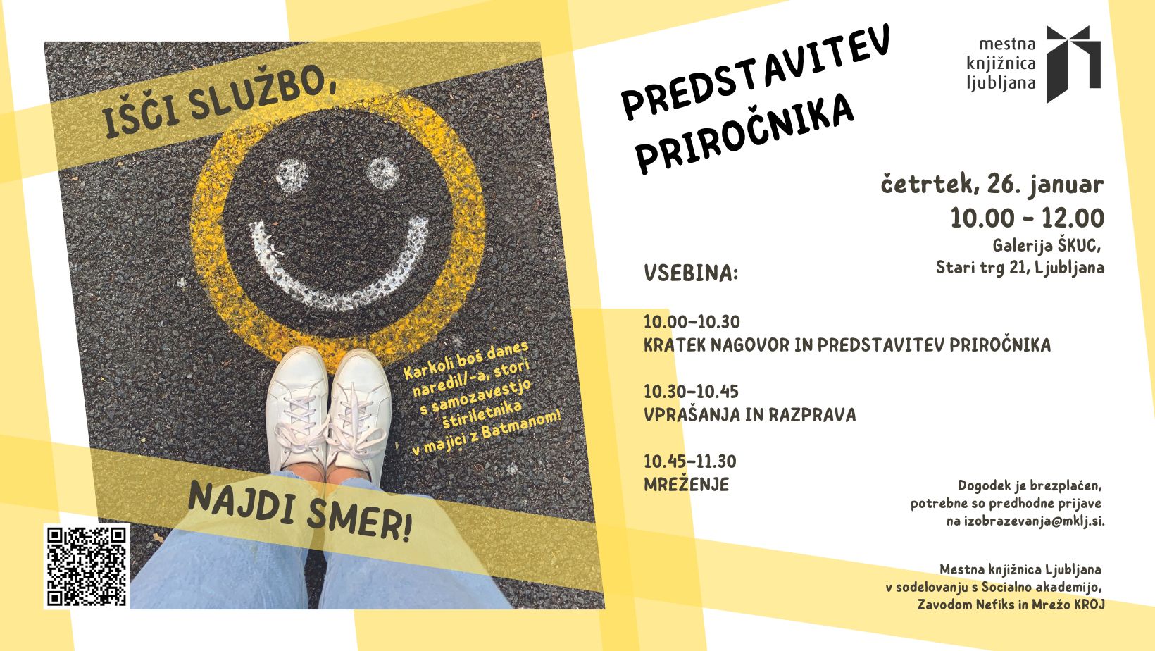 V četrtek, 26. januarja 2023, bo v Galeriji ŠKUC na Starem trgu 21 ob 10. uri predstavitev priročnika Išči službo, najdi smer!, ki je namenjen vsem, ki vstopajo na trg dela.