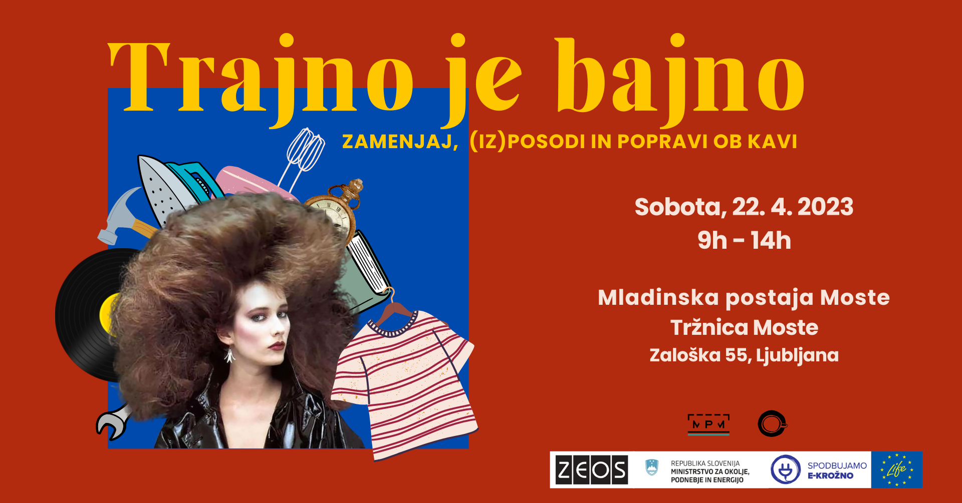 Ob koncu akcije Za lepšo Ljubljano vas v soboto, 22. aprila 2023, vabimo na izmenjevalnico pod imenom "Trajno je bajno". Izmenjevalnica bo potekala med 9. in 14. uro pred in v prostorih Mladinske postaje Moste (tržnica Moste).