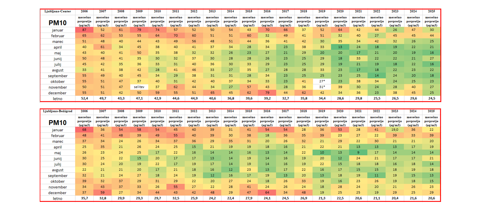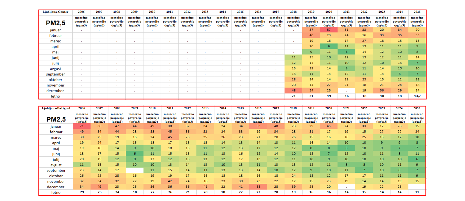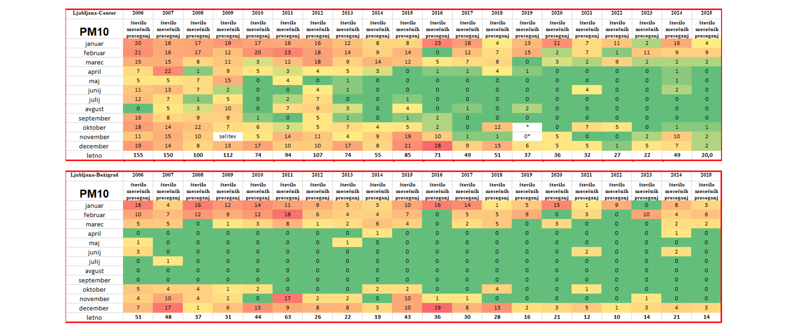 Podatki v tabelah prikazujejo, kako se v Ljubljani izboljšuje kakovost zraka