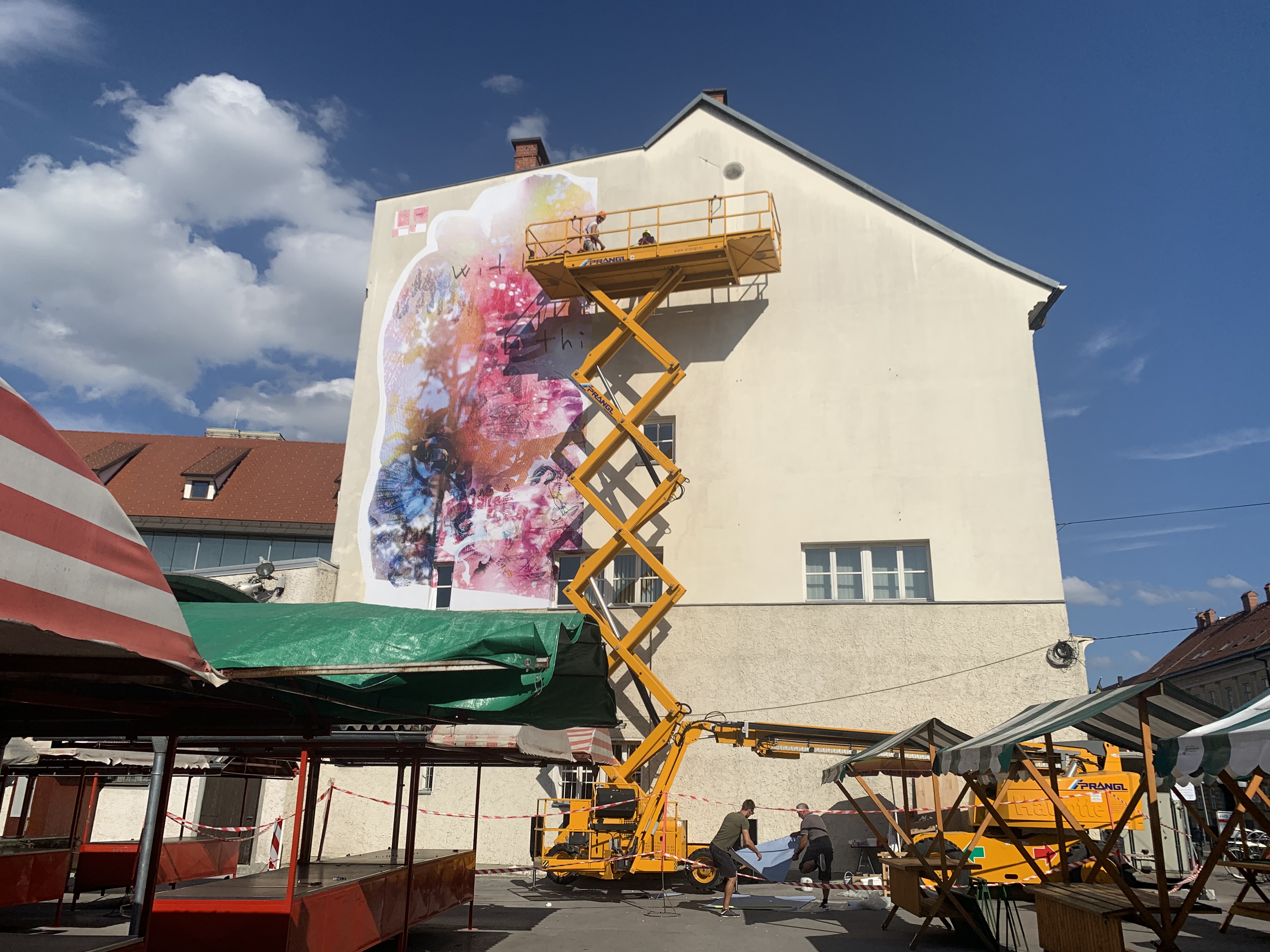Na steni Mahrove hiše na Plečnikovi tržnici vizualni umetnik Jaša Mrevlje Pollak ustvarja novo poslikavo VVithin This Touch.