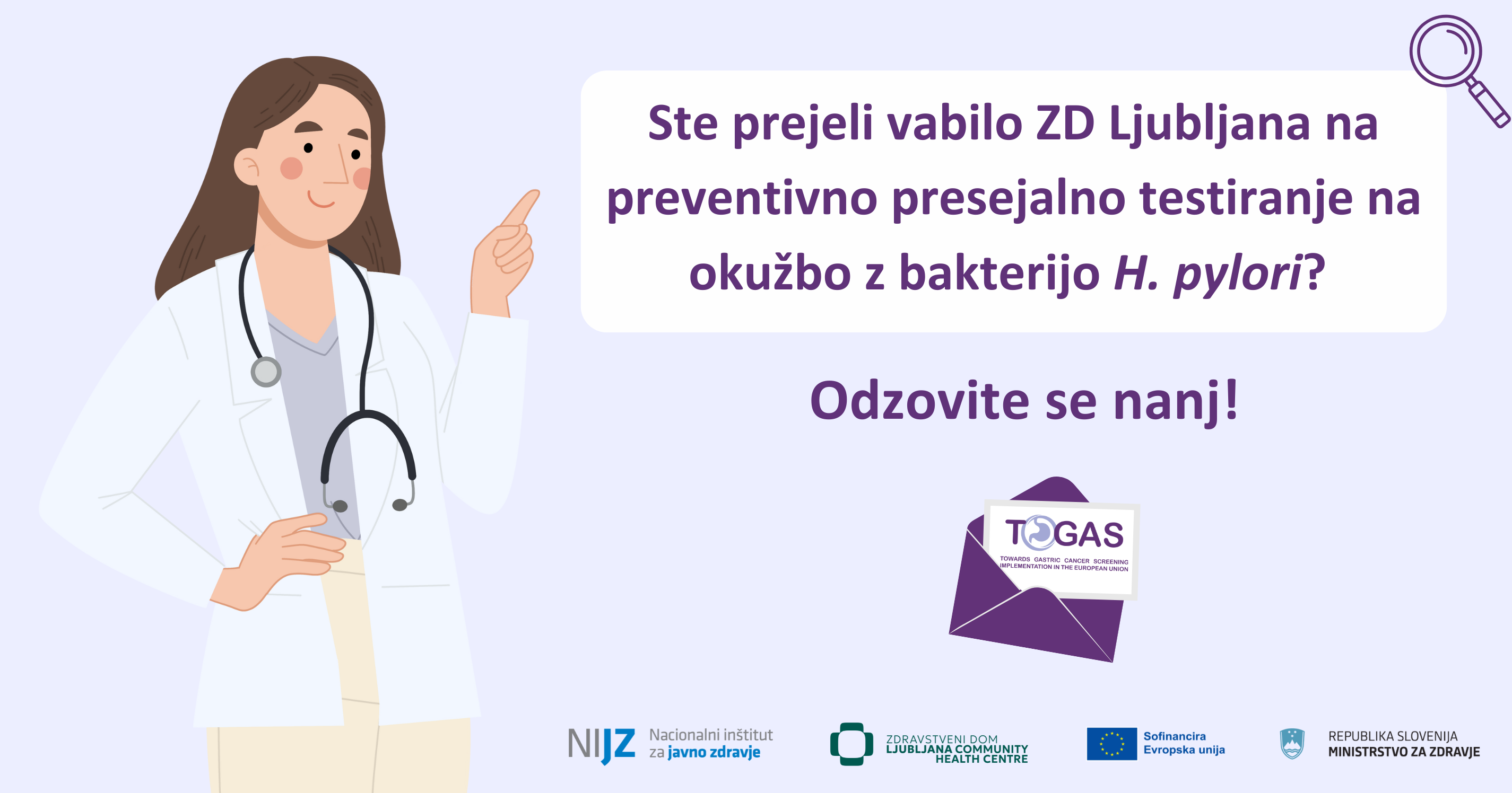 Zdravstveni dom Ljubljana in Nacionalni inštitut za javno zdravje izvajata pilotno preventivno presejalno testiranje na okužbo z bakterijo Helicobacter pylori v starostni skupini 30-34 let. Poskrbite za svoje zdravje in se odzovite vabilu.