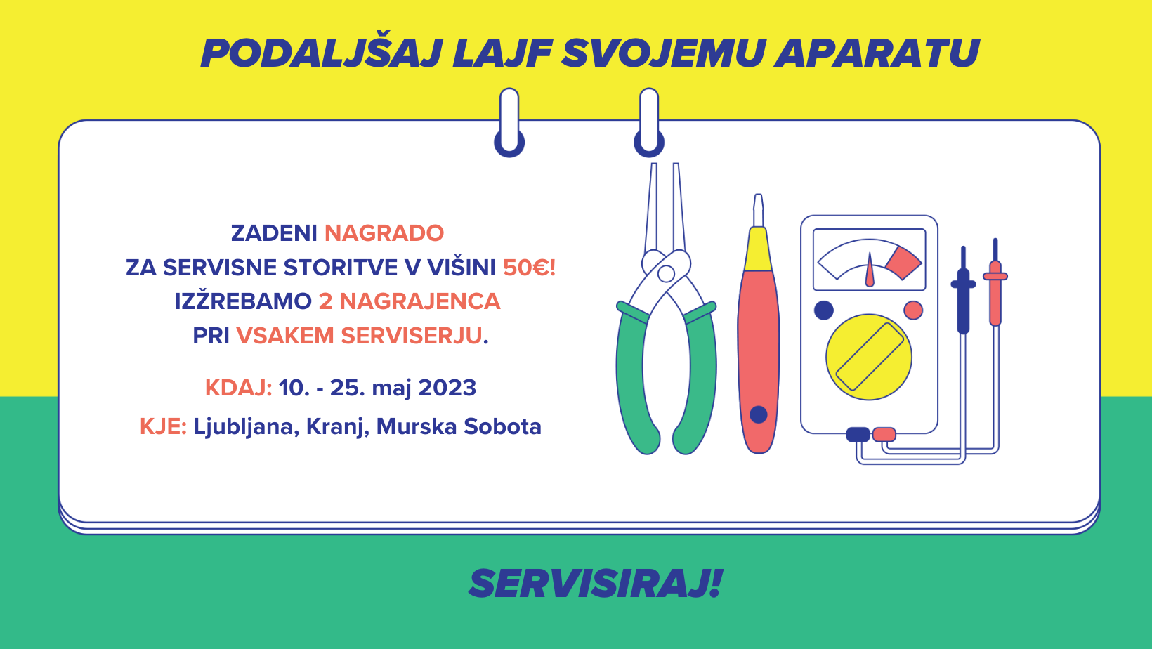 Vsi, ki boste med 10. in 25. majem 2023 svoj električni aparat prinesli v pregled in/ali popravilo na omenjeni servis, lahko sodelujete v nagradni igri za 2x bon za pregled in popravilo v vrednosti 50 evrov pri istem serviserju.