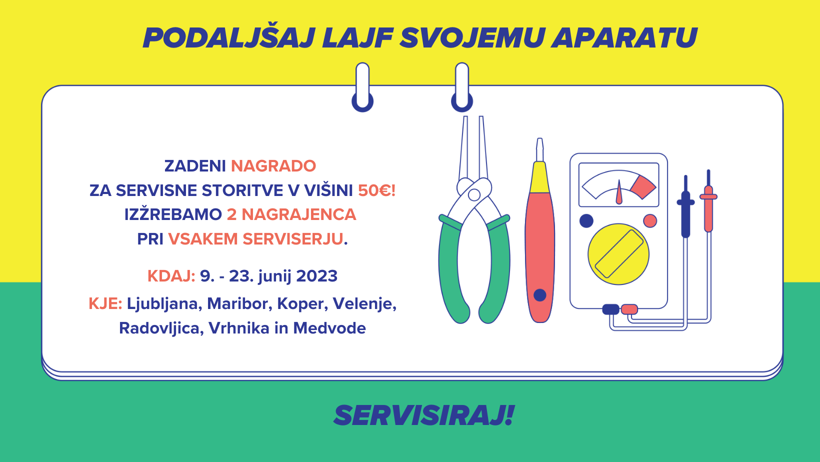 Pokvarjen električni aparat lahko do 23. junija 2023 prinesete k lokalnemu sodelujočemu serviserju, ki bo aparat pregledal oz. opravil diagnostiko in ga na vašo željo tudi popravil. Vsi potrošniki, ki v času trajanja akcije električni aparat prinesejo v pregled in/ali popravilo, lahko sodelujejo v nagradni igri za bon za pregled in popravilo v vrednosti 2x 50 eur pri istem serviserju.