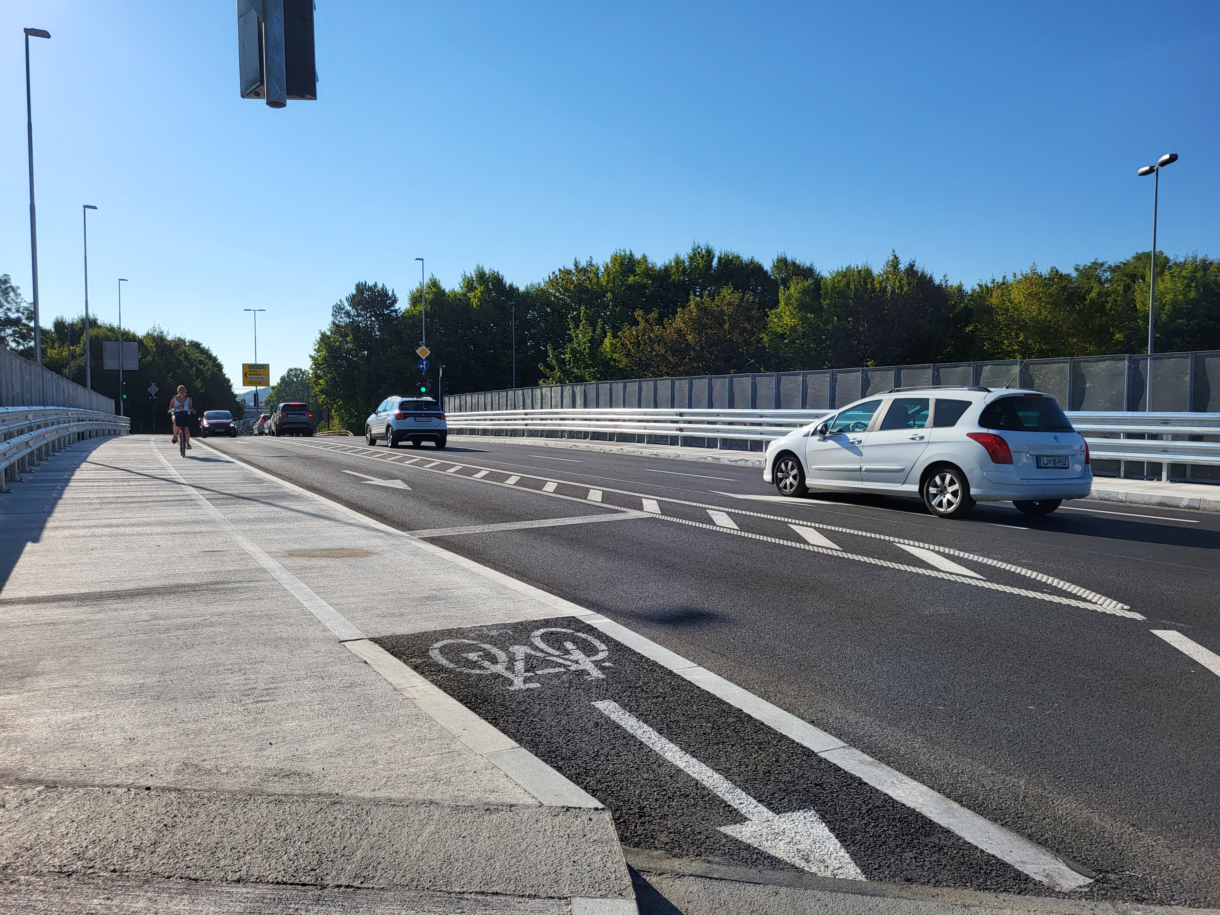 Na nadvozu smo na obeh straneh uredili kolesarske površine in enostranski širok pločnik ter s tem zagotovili zvezno vodenje kolesarjev med obema stranema avtoceste. Na strani proti Kosezam smo kolesarske pasove podaljšali do križišča z Ledarsko ulico, po tej ulici pa bomo v kratkem zarisali še oznake za skupni promet na voznem pasu za motorna vozila in kolesarje (t. i. »sharrow«).