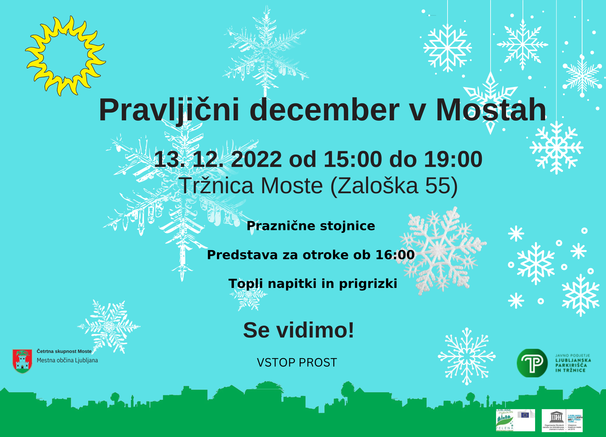 Četrtna skupnost Moste vabi na prireditev Pravljični december v Mostah, ki bo v torek 13. decembra 2022, ob 15. uri na Tržnici Moste.