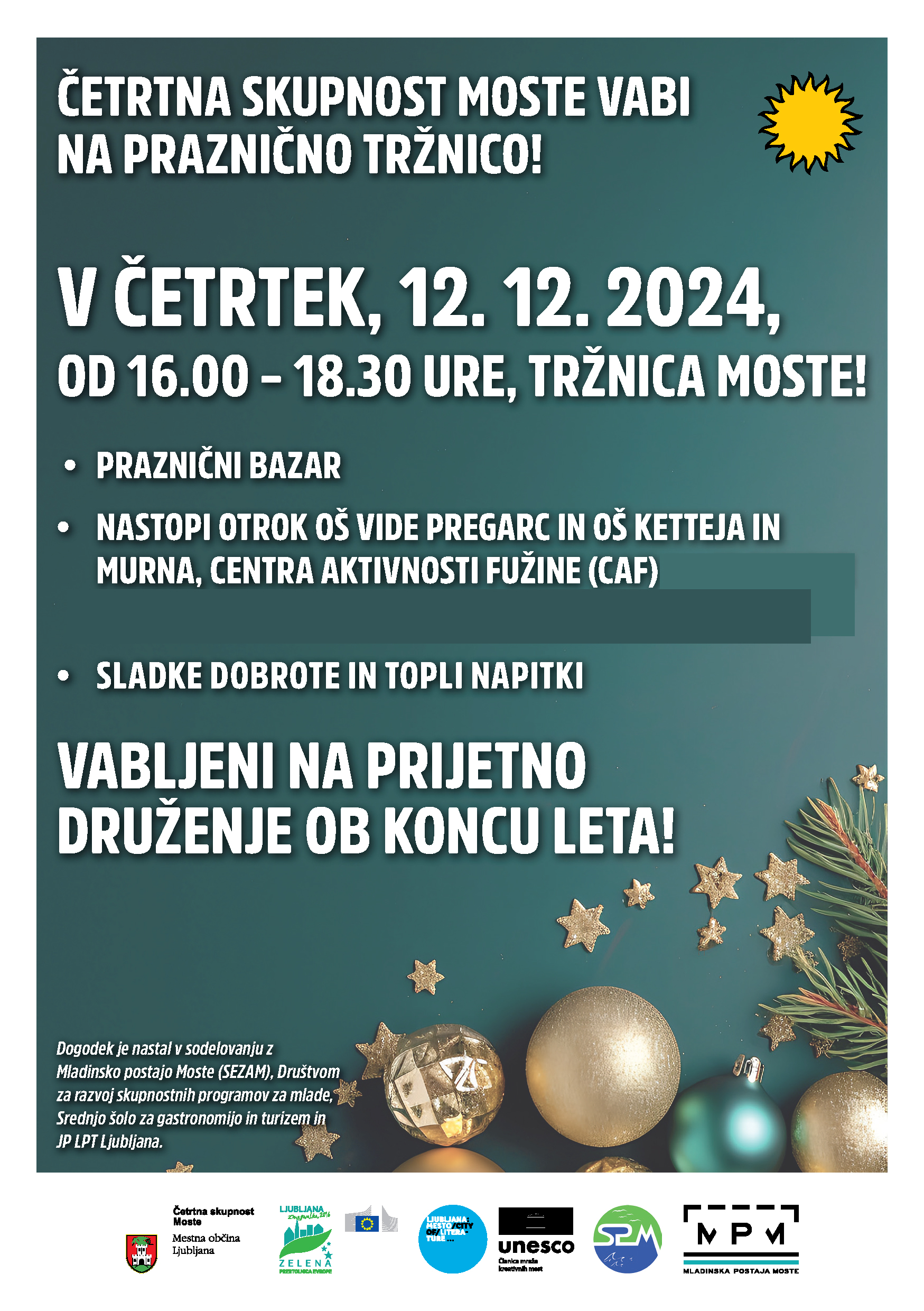 Vabljeni na Praznične Moste, in sicer v četrtek, 12.12.2024, ob 16. uri na Tržnico Moste.