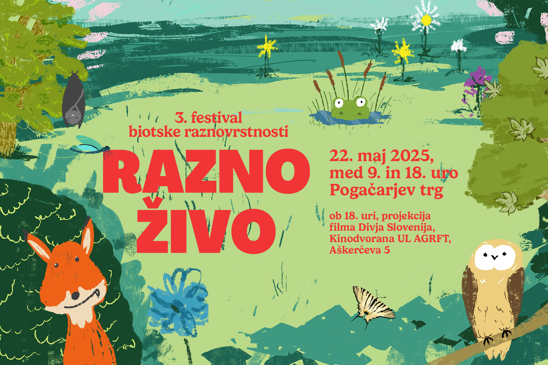 V četrtek, 22. maja 2025, na Pogačarjevem trgu pripravljamo festival Raznoživo, s katerim že tretje leto zapored obeležujemo mednarodni dan biotske raznovrstnosti. Festival letos dopolnjujemo še z ogledom filma Divja Slovenija in razpravo o vplivu naravoslovnih dokumentarnih filmov za dvig družbene zavesti o nujnosti ohranjanja narave.