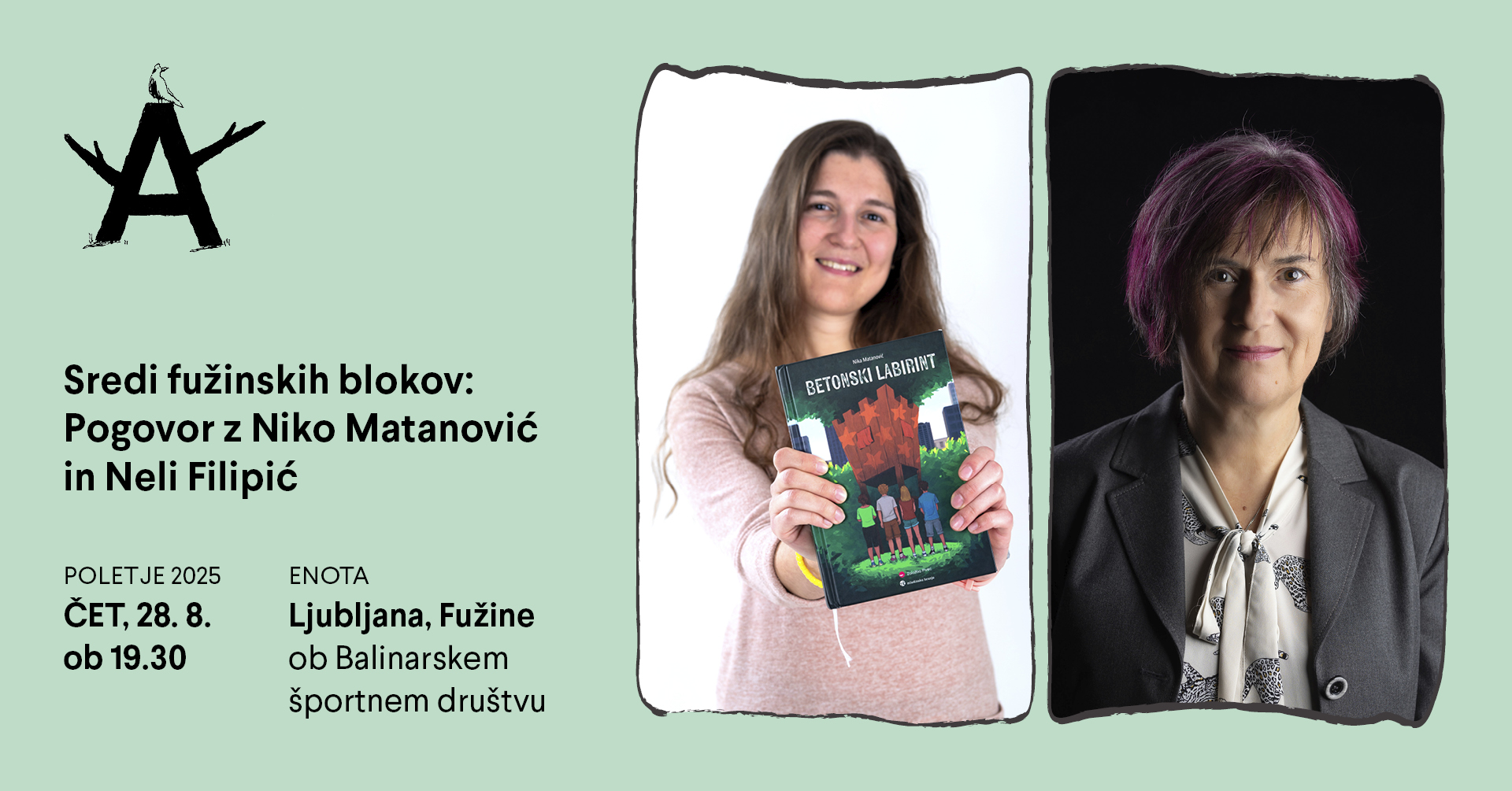 Enkrat na sezono se tradicionalno zberemo sredi fužinskih blokov, da bi se skupaj pogovarjali o zanimivi knjigi. Tokrat vabimo, da 28. avgusta 2025 v Parku Muste ob 19.30 uri skupaj z nami spoznaš mlado pisateljico Niko Matanović, ki bo v pogovoru z Neli Kodrić predstavila svoj mladinski roman Betonski labirint.