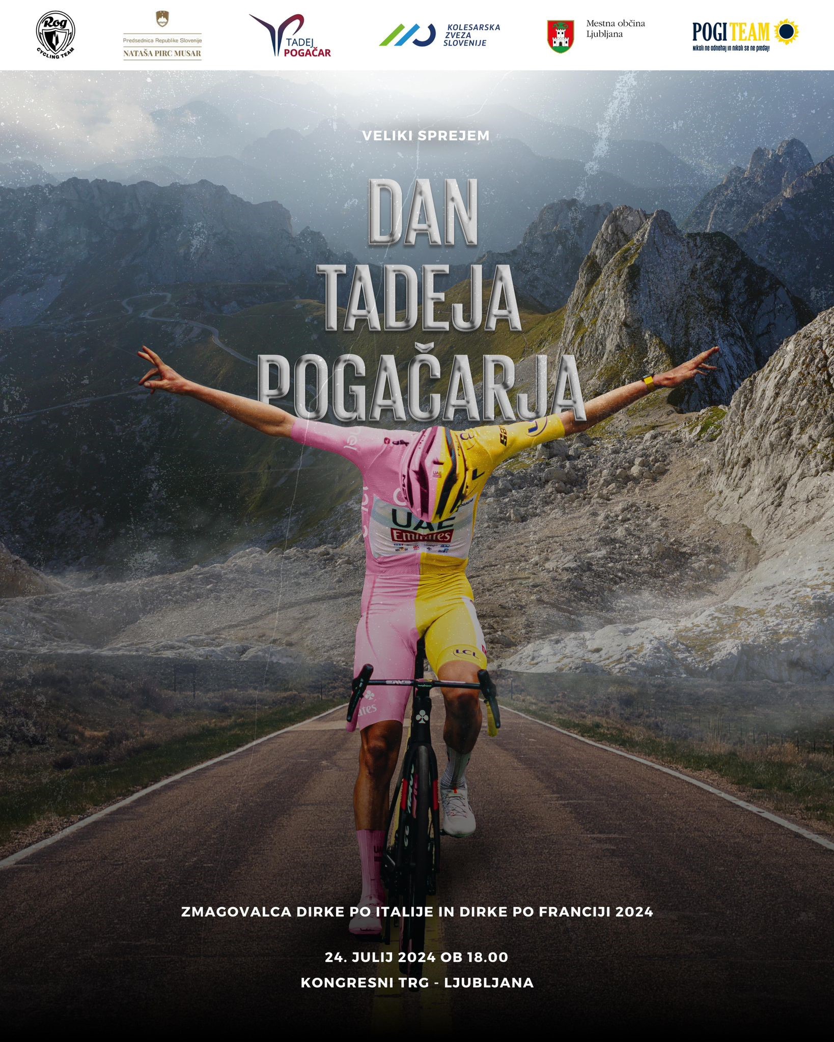 V sredo, 24. julija 2024, v Ljubljani pripravljamo sprejem za Tadeja Pogačarja, velikega zmagovalca Dirke po Franciji. Tadej bo v Ljubljano prikolesaril in vabimo vas, da ga pozdravite že na njegovi poti do Kongresnega trga, kamor bo predvidoma prispel ob 18. uri.