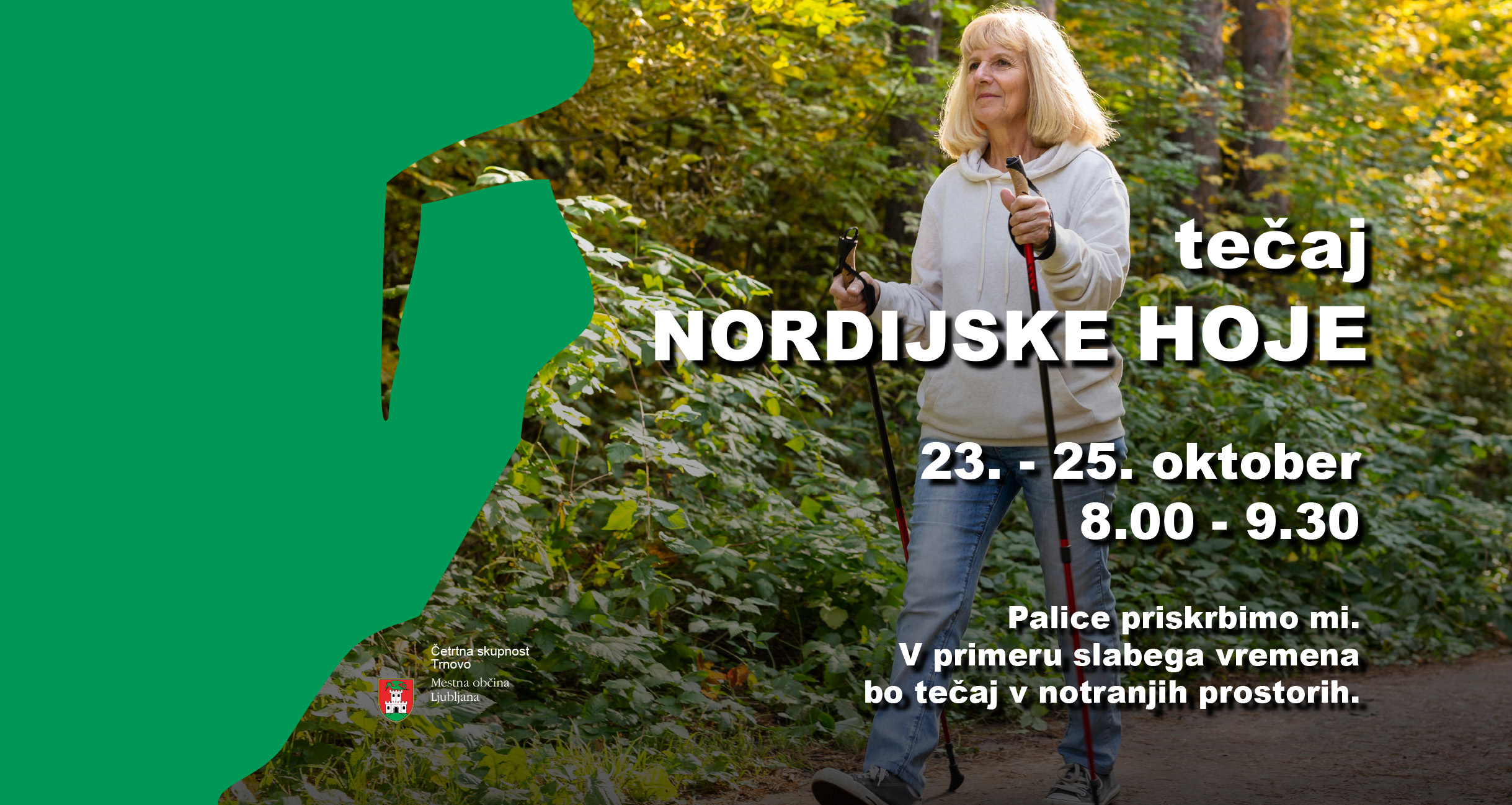 Četrtna skupnost Trnovo vabi na tečaj nordijske hoje, ki bo potekal od 23. do 25. oktobra 2023, med 8. in 9.30 uro.