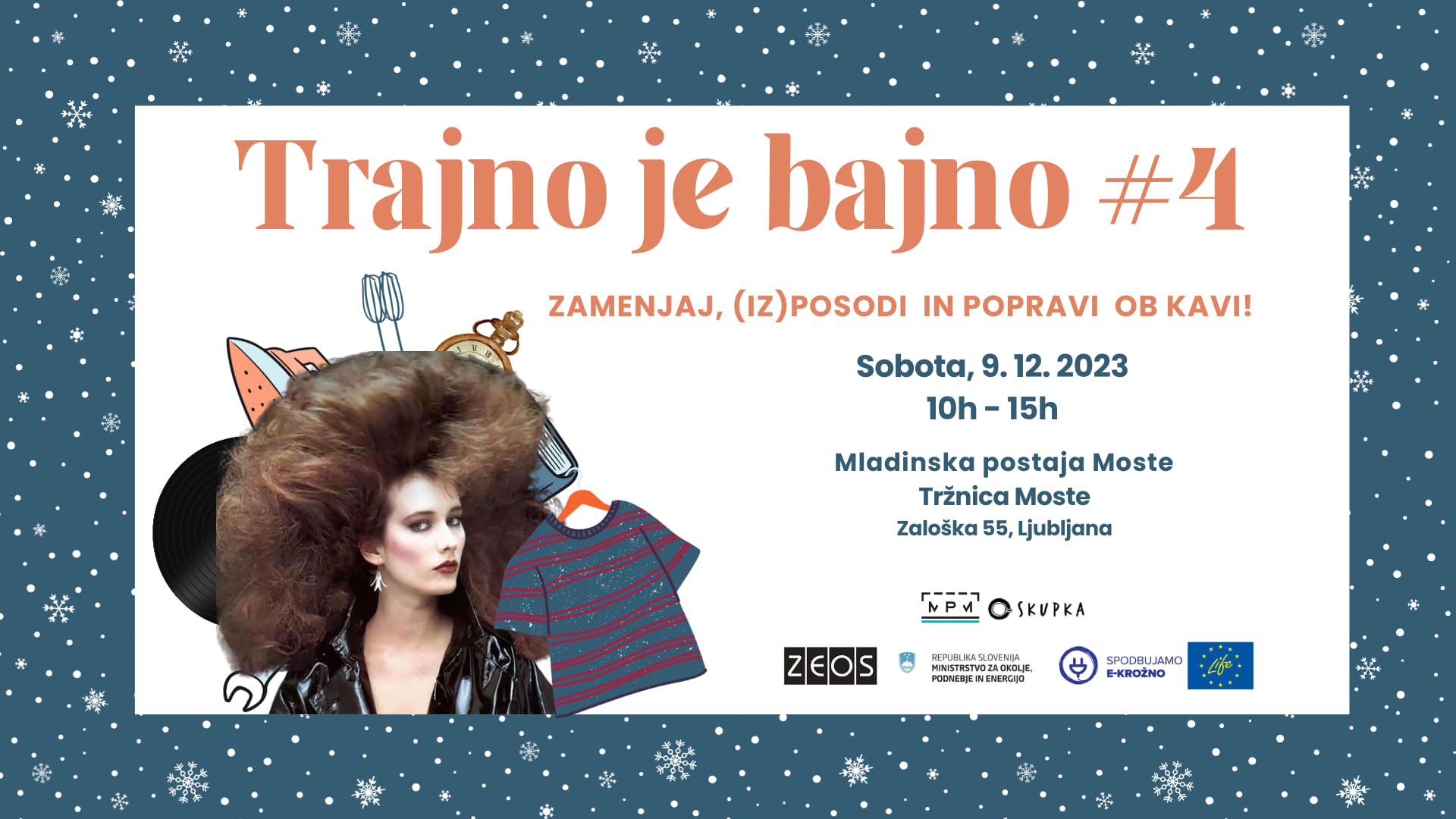 Četrtna skupnost Moste vabi na izmenjevalnico Trajno je bajno #4, ki jo v Mladinski postaji Moste pripravljajo v soboto, 9. decembra 2023, med 10. in 15. uro.