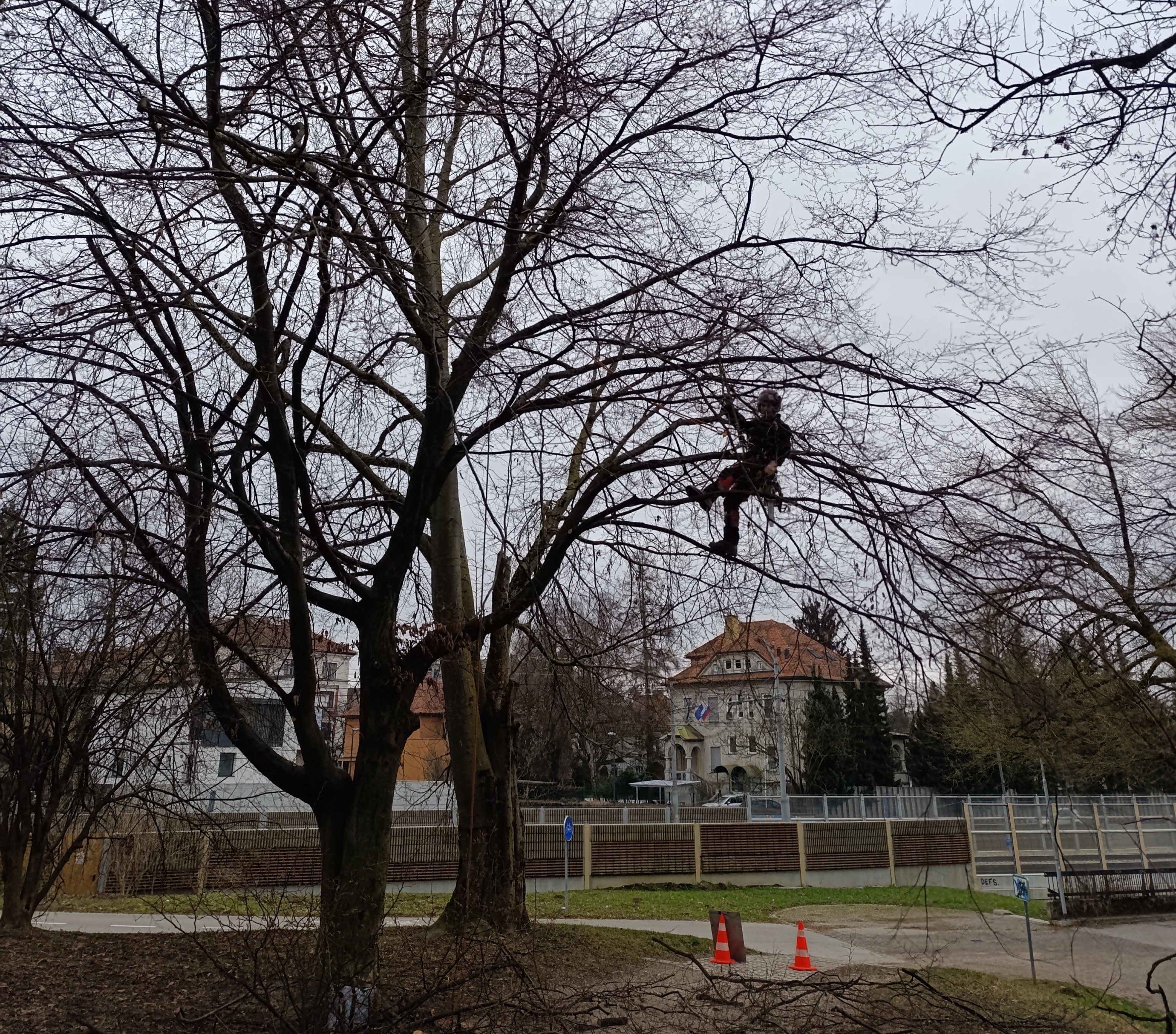 V parku Tivoli, v okolici ribnika, poteka obrezovanje in nega dreves.