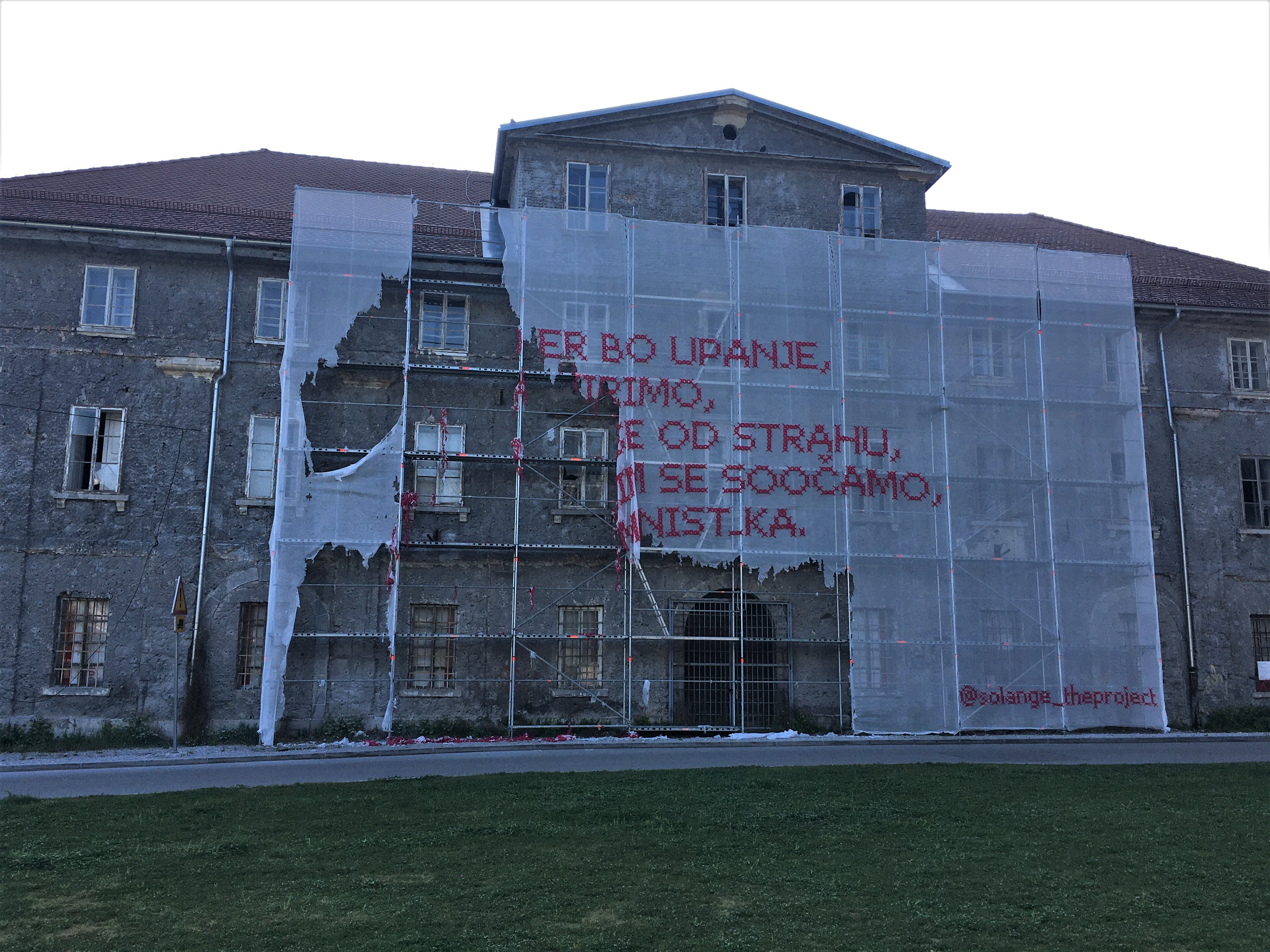 Delo z naslovom SOLANGE (kar v nemščini pomeni »dokler«), nameščeno na pročelje Palače Cukrarna, so navdahnila vprašanja feminizma, predvsem pa iskanje socialne pravičnosti. Delo opozarja na širok spekter na spol vezanih družbenih neenakosti, izkazuje dvome o obstoječih strukturah moči in zahteva krepitev vloge žensk. Umetniško delo z napisom »Dokler bo upanje, ki ga širimo, močnejše od strahu, s katerim se soočamo, bom feminist_ka.« je bilo na pročelje Palače Cukrarna nameščeno v petek, 30. aprila, ob odprtju razstave Ko gesta postane dogodek v Mestni galeriji Ljubljana.