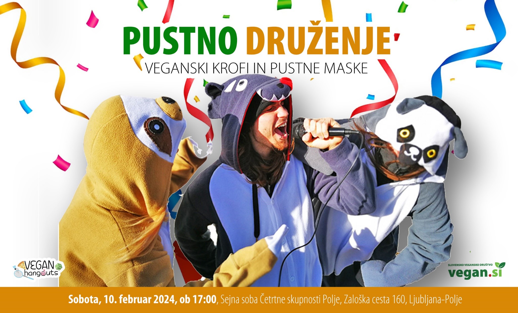 Slovensko vegansko društvo organizira pustno druženje v soboto 10. 2. 2024 ob 17.00 uri na sedežu ČS Polje, Zaloška cesta 160, sejna soba