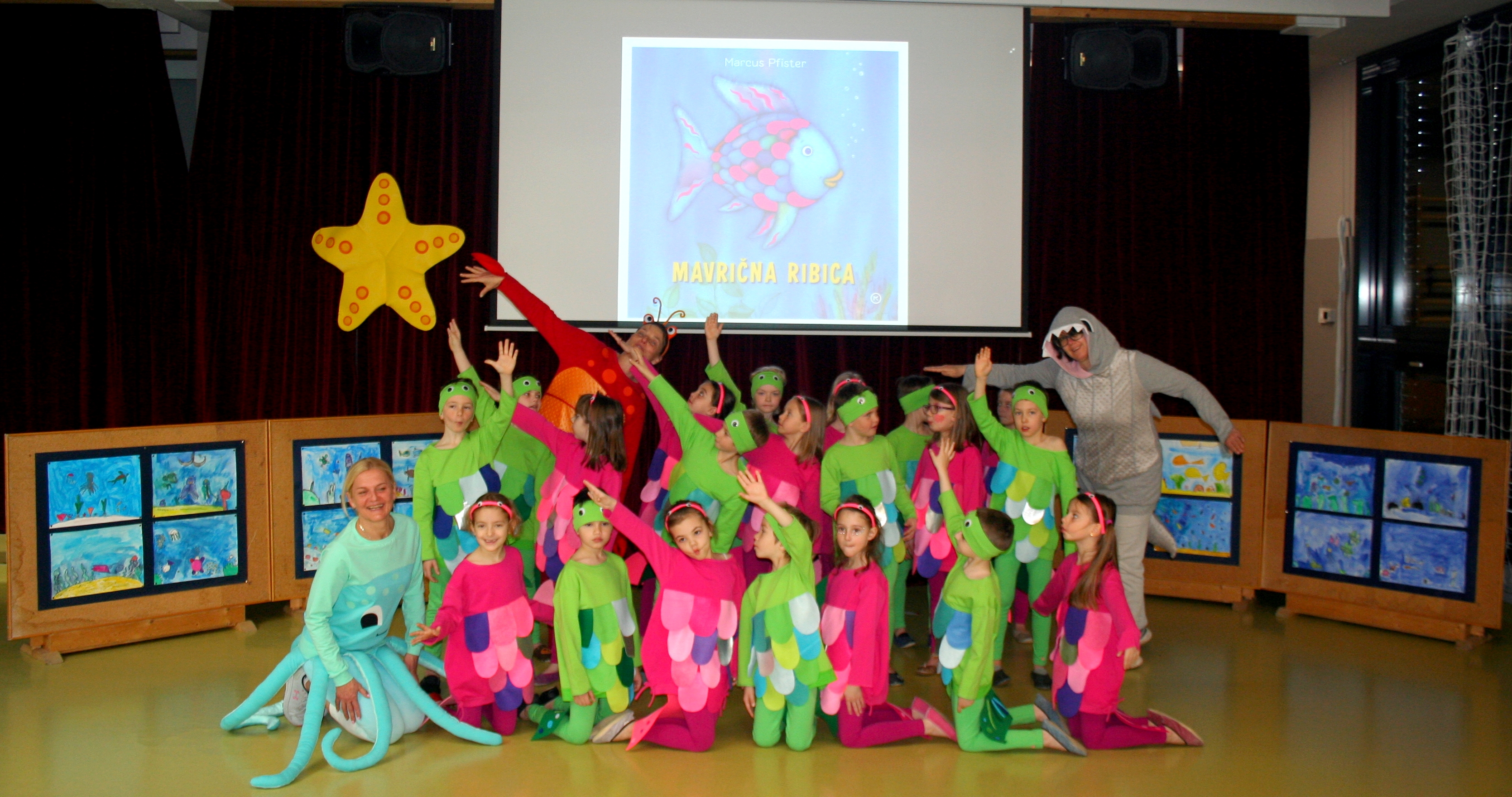 Učenci in učiteljice 1. a razreda Jasmina Zakrajšek, Andreja Absec in Maja Vidmar so v šolo pripeljali Mavrične ribice, ki so se veselile in naplesale kar v šoli in pred njo.
