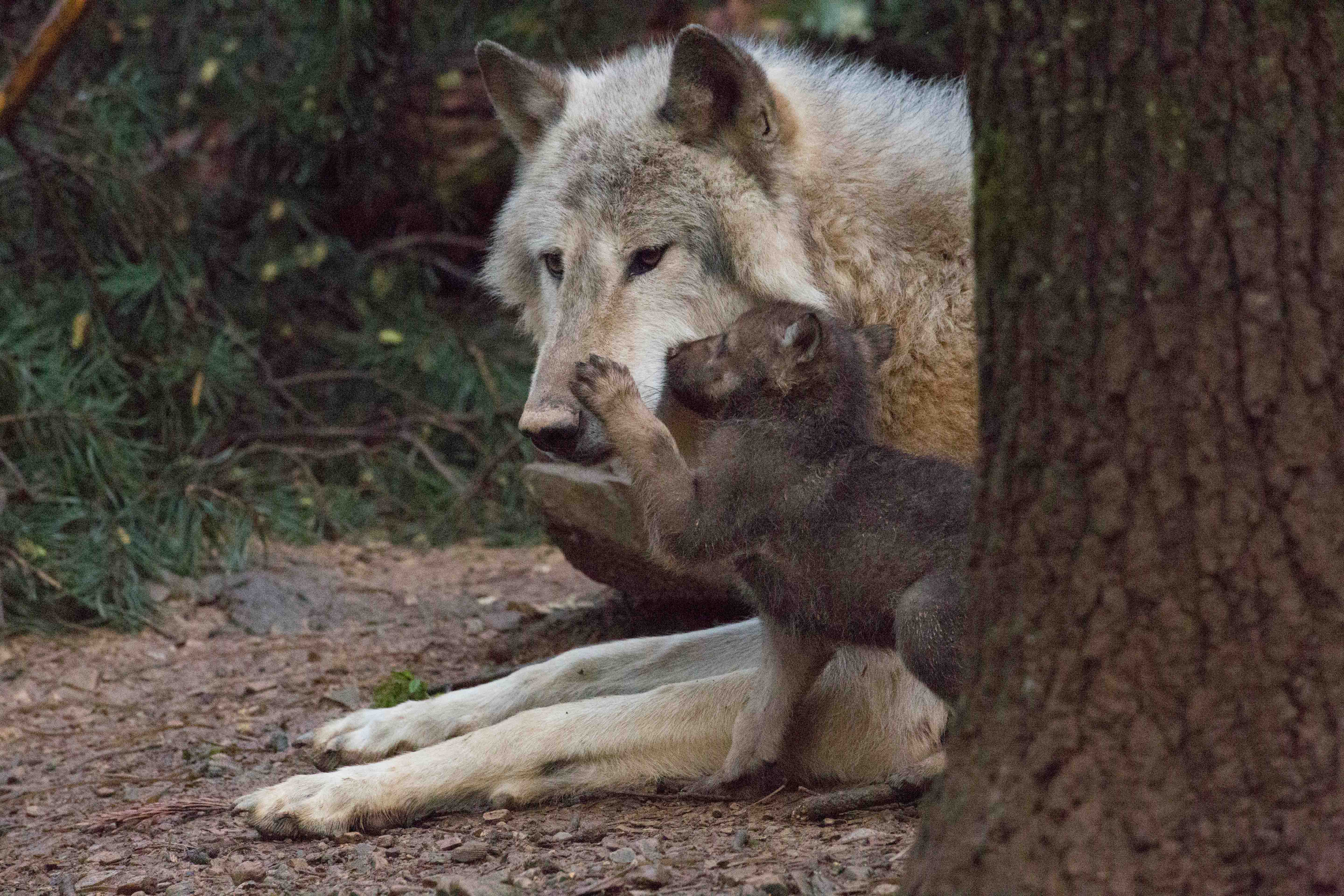 Ko smo v ogrado dodali velike borove veje, sta jih volkulji izbrali za senčno in zračno dnevno bivališče. Isa je priložnost izrabila, da je ob prvotnem brlogu začela kopati nov, večji rov. Aragorn je mladiče, ki so silili vanj, v gobcu vztrajno odnašal stran od »gradbišča«. Poleg tega, da ves čas pozorno nadzoruje okolico, bdi tudi nad družinskim jedilnikom. Isa in Freya mladiče izmenično dojita, celo mladiče druga druge, Aragorn pa jima pozorno nakaže, kdaj je čas za to. Zdaj starejši že prvikrat pokušajo meso. Pri hranjenju vlada hierarhija in vsakdo mora počakati, da pride na vrsto. Ob tem boste morda videli, da volkovi hrano pogoltnejo in jo kmalu na drugem mestu izbljuvajo. Ni jim slabo – na ta način prinesejo obrok drugim članom tropa, zlasti samicam v brlogih in mladičem, ki za grižljaje prosijo z lizanjem odraslih po gobčku.
