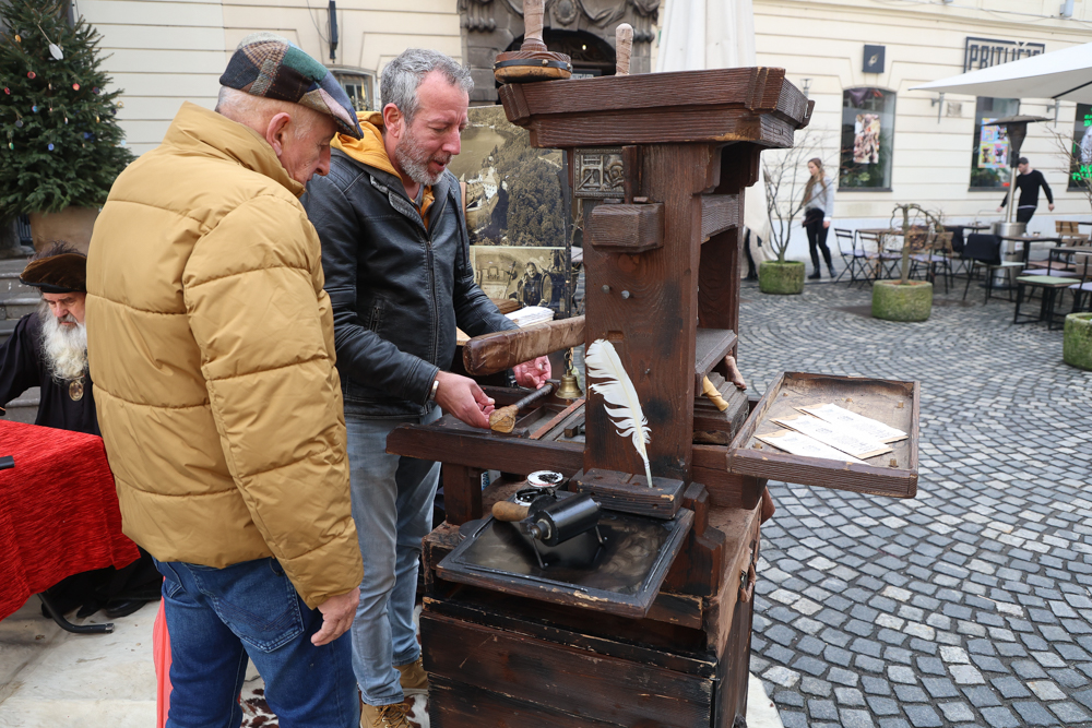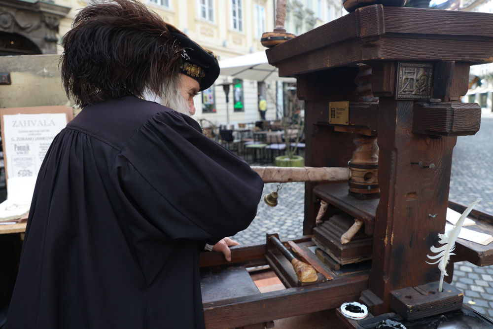 Na stojnicah boste lahko do 14. ure izbrali knjige, ki jih podarjajo iz Mestne knjižnice Ljubljana, in vanje vtisnili spominski žig, ter pri mojstru Janezu, ki bo predstavil srednjeveški tisk, natisnili spominsko listino.