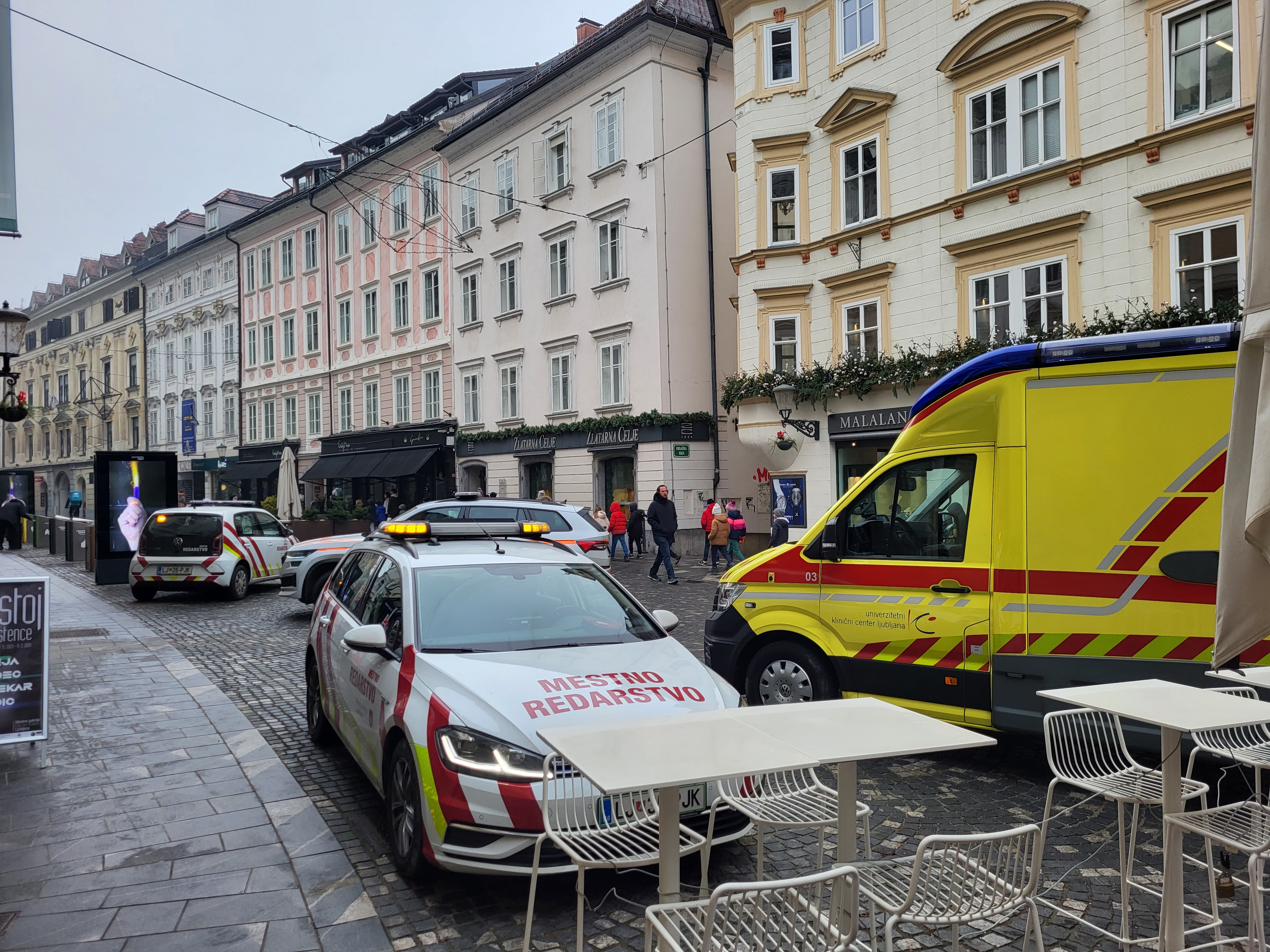 Mestni redarji so pomagali pri oživljanju moškega, ki se je v četrtek, 21. decembra 2023, zgrudil na Mestnem trgu.