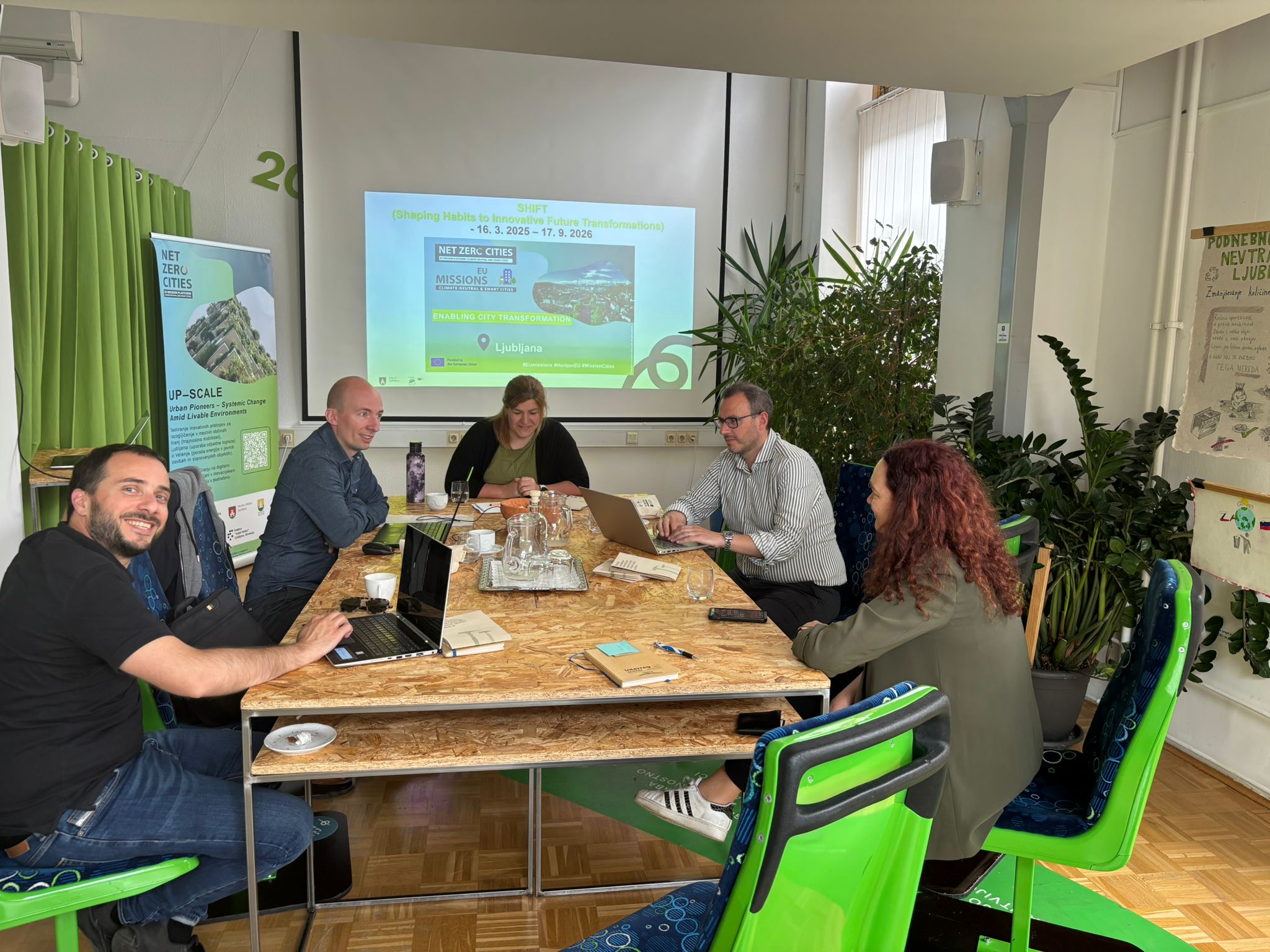 V Info točki Misija 100 je v torek, 20. maja 2025, potekala predstavitev in prvi delovni sestanek projekta SHIFT, katerega glavni cilj je približati ideje trajnostnosti in podnebnih politik meščankam ter meščanom na skupni poti do podnebne nevtralnosti v Ljubljani.