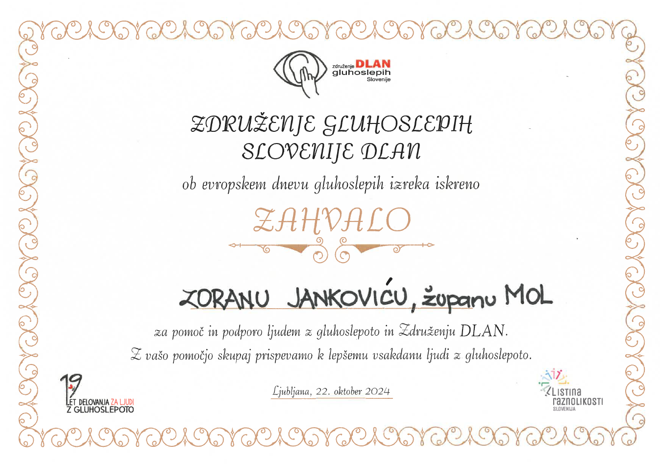 Združenje gluhosplepih Slovenije Dlan je ob evropskem dnevu gluhoslepih županu Zoranu Jankoviću izreklo zahvalo za pomoč in podporo ljudem z gluhoslepoto in Združenju Dlan.