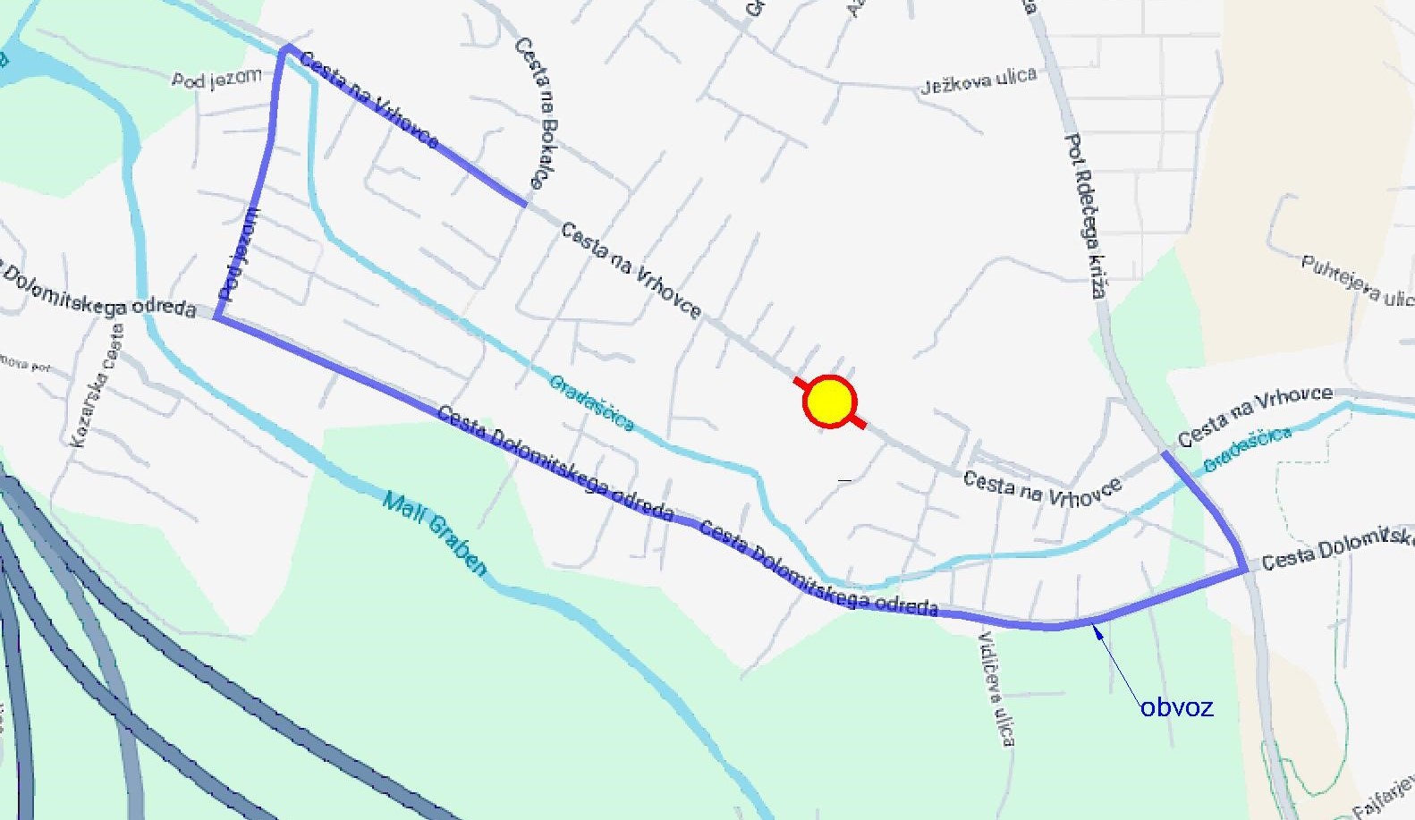 Obvoz bo po Cesti Dolomitskega odreda, avtobusi na liniji 14 bodo začasno vozili le naravnost po Cesti na Brdo in Cesti na Bokalce.