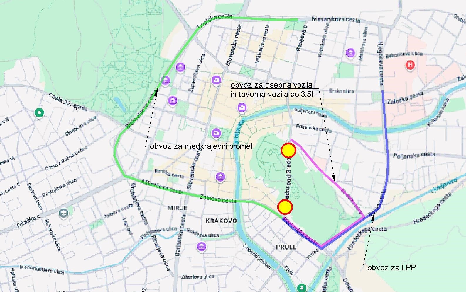 Obvoz za osebna in tovorna vozila do 3,5t bo potekal po Karlovški in Roški cesti ter Streliški ulici.