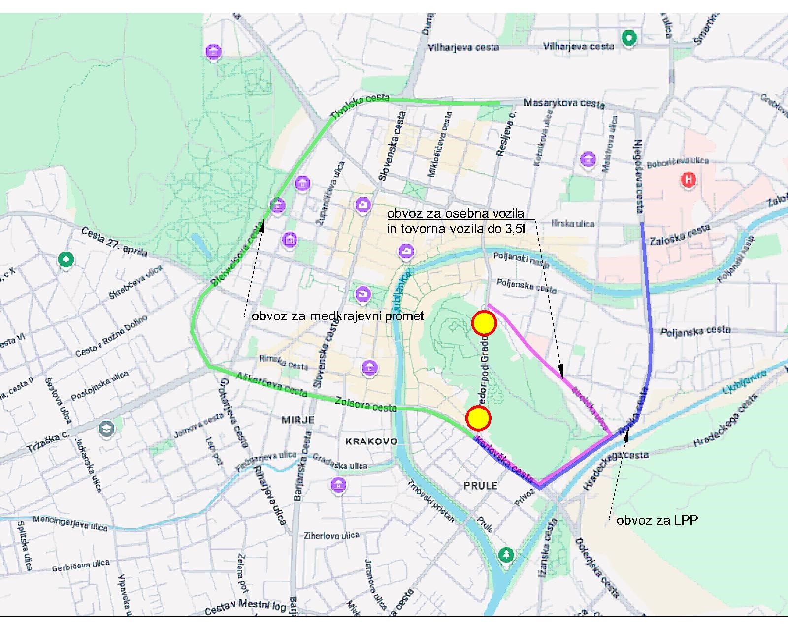 Obvoz za osebna in tovorna vozila do 3,5t bo voden po Karlovški cesti, Roški cesti in Streliški ulici in obratno.