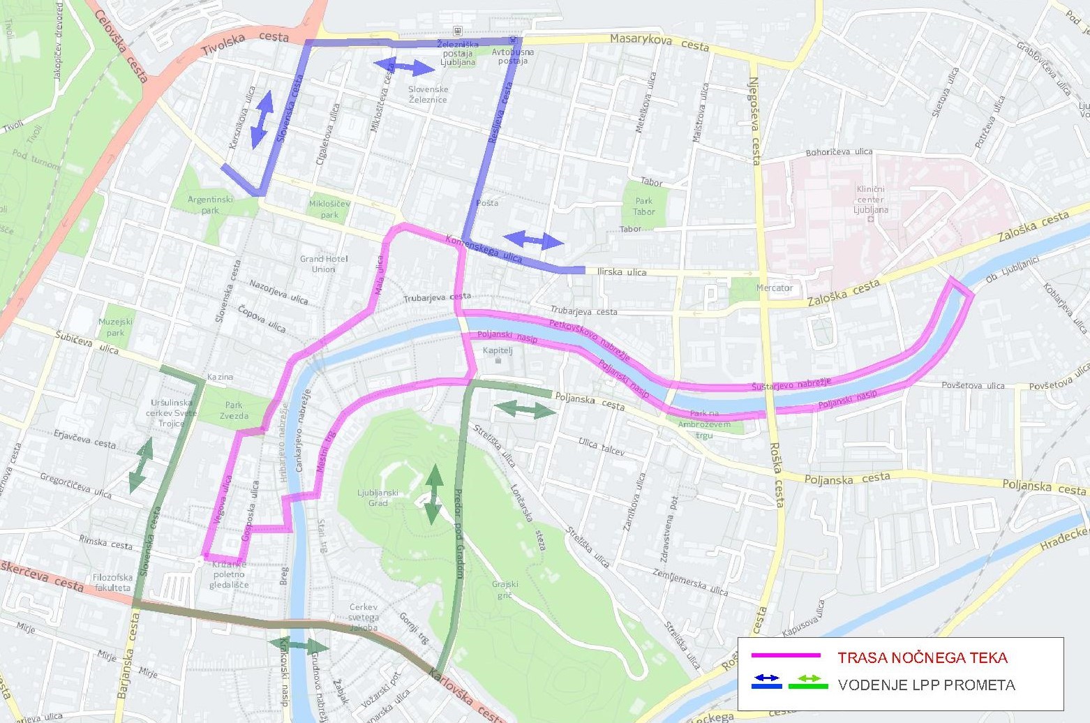 Promet bo oviran na naslednjih ulicah: Ciril – Metodov trg, Kopitarjeva ulica, Poljanski nasip, spodnja etaža Fabianijevega mostu, Šuštarjevo nabrežje, brv, Poljanski nasip, Materinski most, Šuštarjevo nabrežje, Petkovškovo nabrežje, Resljeva cesta, Komenskega ulica, Mala ulica, Trubarjeva cesta, Prešernov trg, Wolfova ulica, Kongresni trg, Vegova ulica, Trg francoske revolucije, Gosposka ulica, Novi trg, Breg, Čevljarski most in Mestni trg.