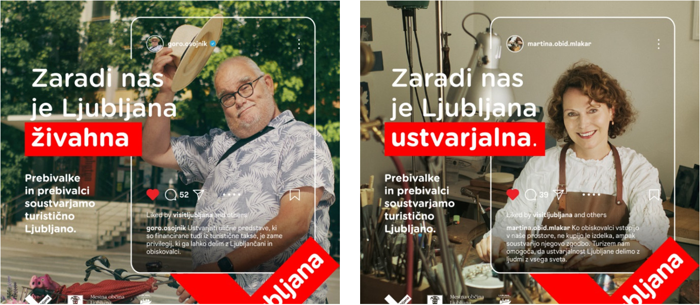 Kampanja »Zaradi nas je Ljubljana…« skozi zgodbe prebivalcev prikazuje, da kakovost bivanja in privlačnost Ljubljane kot turistične destinacije temeljita na aktivnem soustvarjanju prebivalk in prebivalcev, katerih vsakodnevna dejanja in vpetost v razvoj mesta predstavljata ključen dejavnik trajnostnega turističnega razvoja. Tako nam med drugim umetnik Goro Osojnik, oblikovalka nakita Martina Obid Mlakar, receptor Nik Praznik ter Kaja s psičko Hildo skozi svoje zgodbe sporočajo, da je zaradi njih Ljubljana živahna, ustvarjalna, gostoljubna in urejena.
