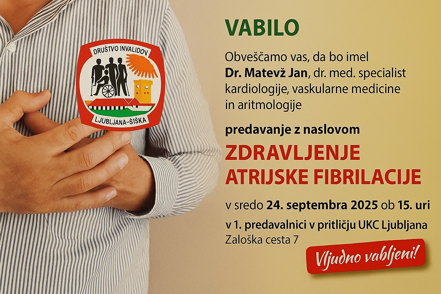 V sredo, 24. septembra 2025, bo ob 15. uri v pritličju UKC Ljubljana predavanje Zdravljenje atrijske fibrilacije. Predaval bo dr. Matevž Jan, dr. med. specialist kardiologije, vaskularne medicine in aritmologije.