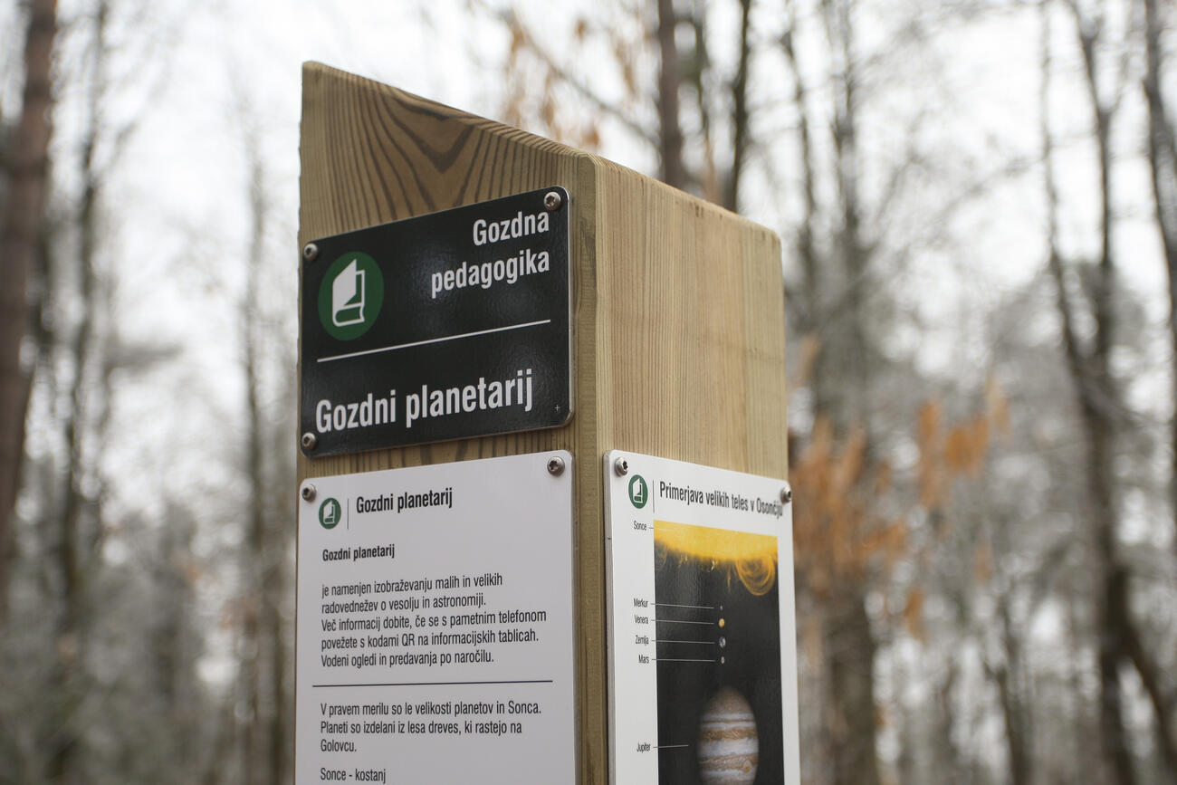 V mestnem gozdu Golovec prepletamo različne vsebine z več področij, od narave in okolja, prek pedagogike, zdravja in psihologije, do fizike in astronomije. Lesena instalacija Gozdni planetarij ponazarja naše Osončje s planeti.