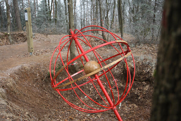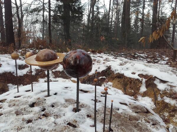 Postavili smo dve učni vsebini. V luknji premera približno tri metre je iz kostanjevih pilotov oblikovana imaginarna površina sonca, katere ukrivljenost ustreza premeru sonca v primerjavi z velikostjo planetov na kovinskih palicah.