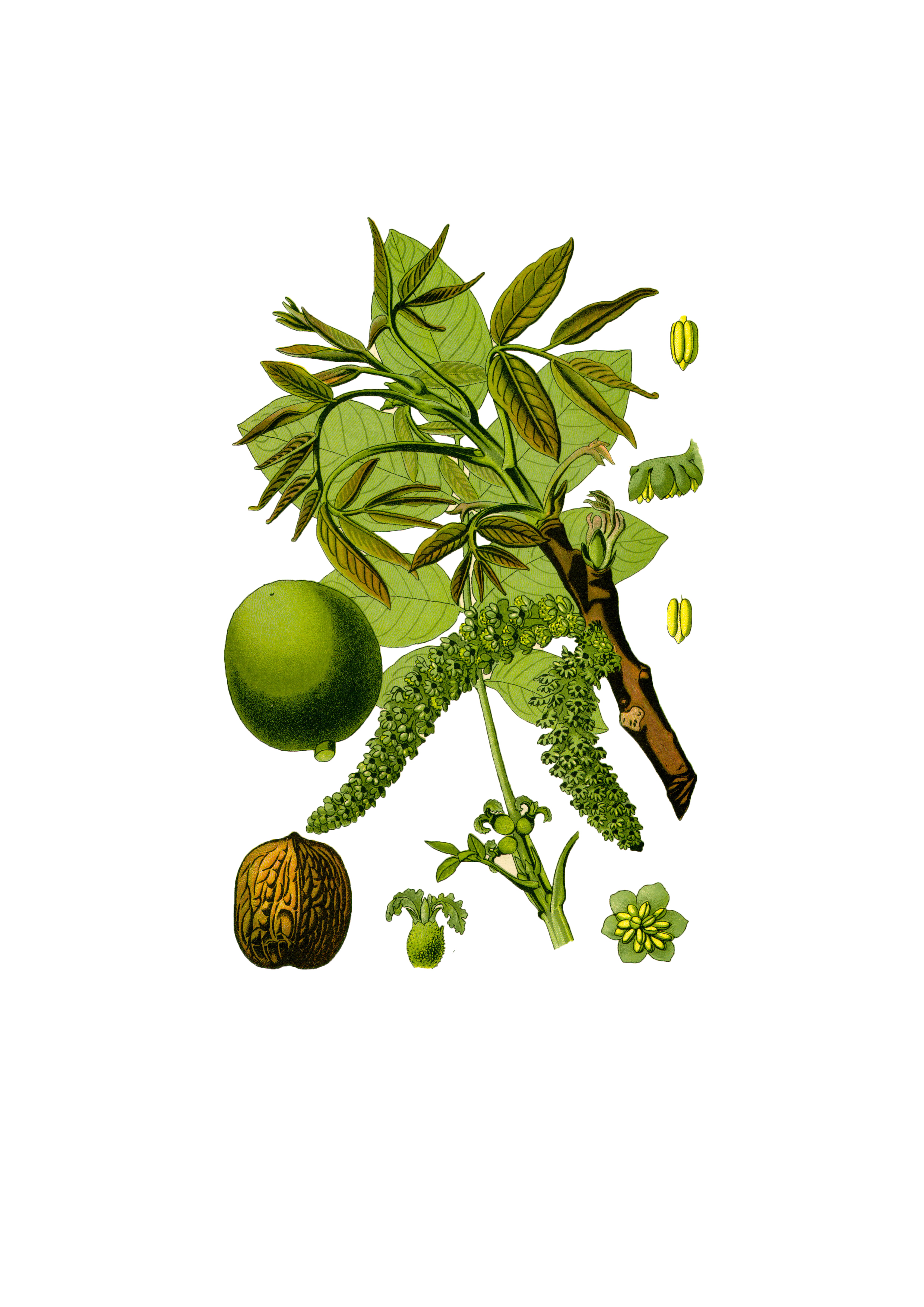 List je sestavljen iz 7 – 9 lističev. Mladi listi so sprva rdečkasti, pozneje zeleni. Oreh je enodomna rastlina z ločenimi moškimi in ženskimi cvetovi, ki se oprašuje s pomočjo vetra. Moška socvetja imajo obliko mačic. Plod je koščičast in ga imenujemo oreh. Ima zeleno lupino, ki jeseni porjavi in poči.Cela rastlina ima močen vonj, vsebuje čreslovine (do 10 % elagotaninov), flavonoide, eterična olja in juglon, ki deluje alelopatsko – preprečuje rast drugih rastlin v neposredni bližini. Orehove liste se uporablja za odganjanje uši, bolh in drugih žuželk ter v zdravilstvu.