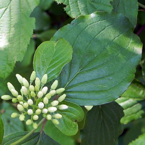 Za razliko od rumenega drena se pri rdečem drenu beli cvetovi pojavijo po olistanju. Sočni temnomodri plodovi dozorijo že zgodaj jeseni in niso užitni.