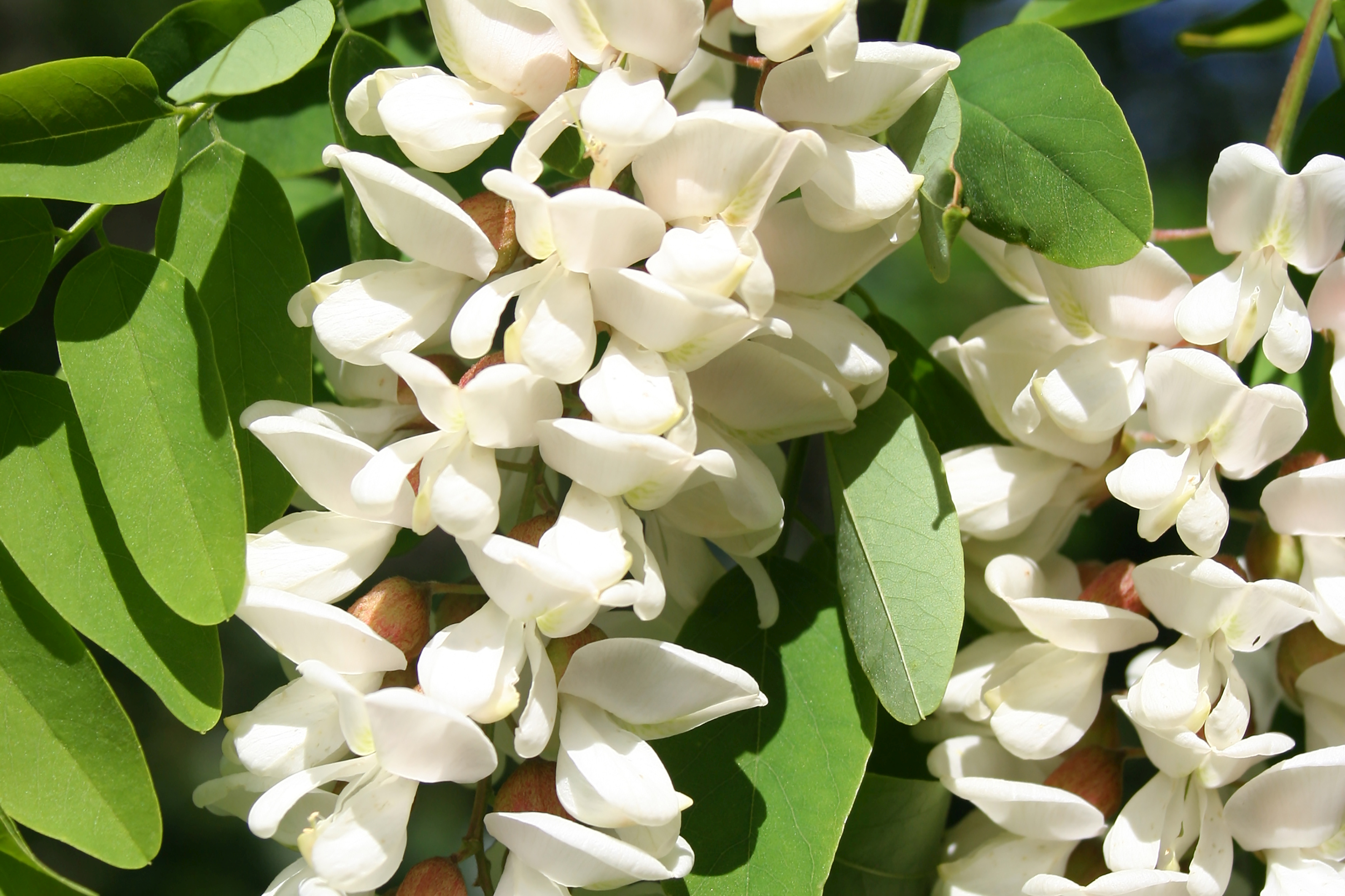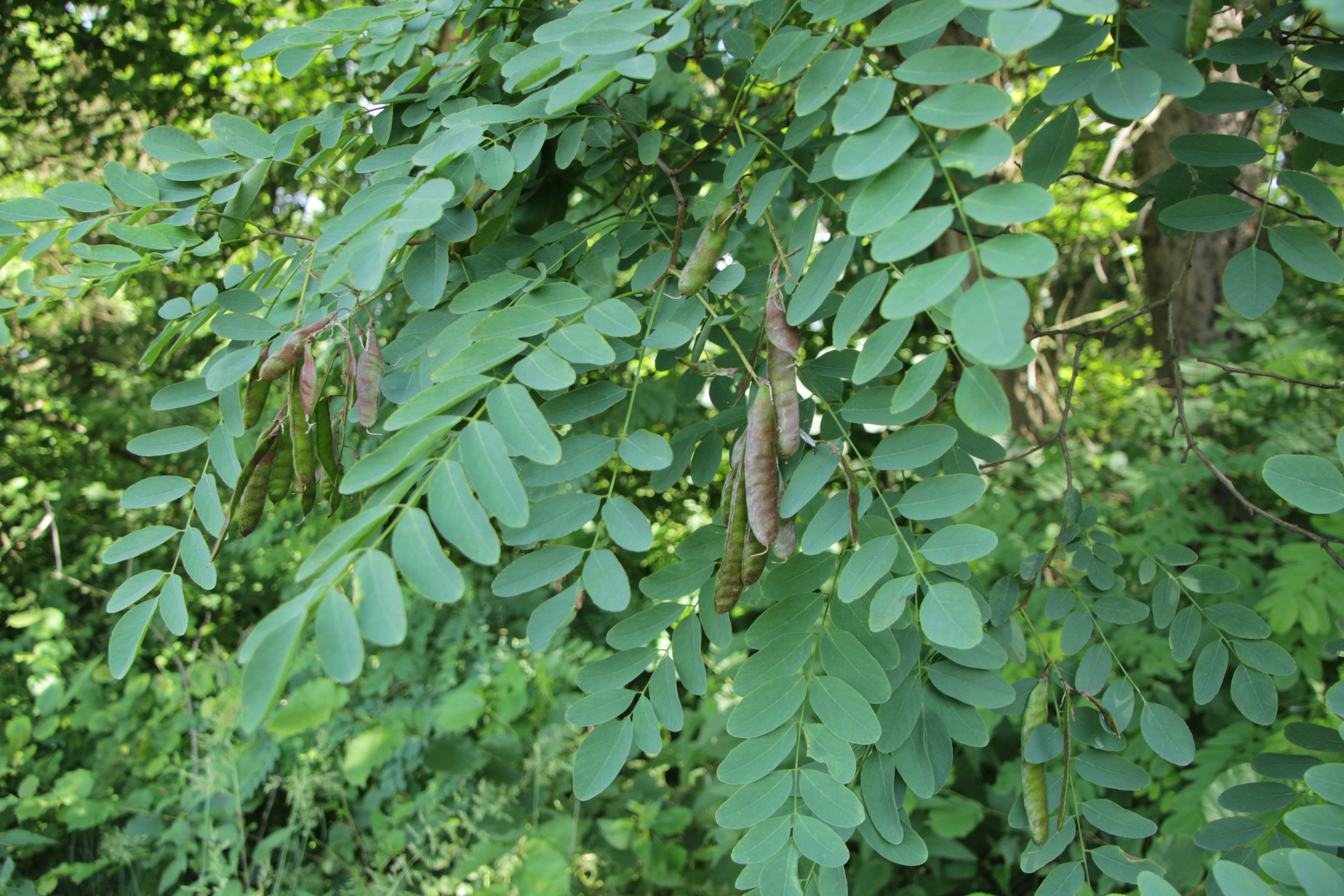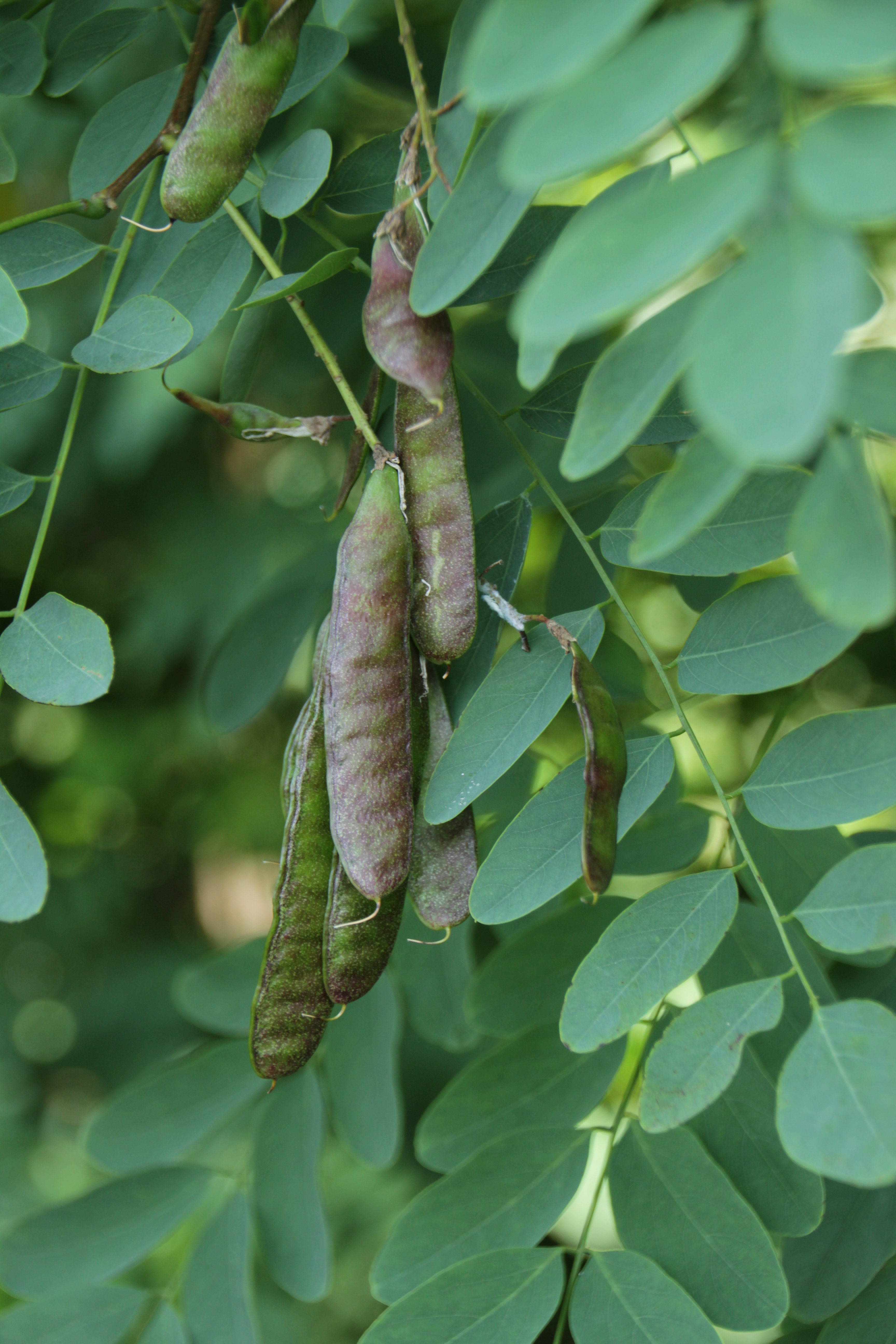 Opis: Robinija, znana tudi pod napačnim imenom akacija, je do 30 m visoko listopadno drevo z redko, zračno krošnjo. Koreninski sistem je široko razrasel, gost in večinoma plitev, na ustreznih tleh globlji, v mladosti ima močno glavno korenino. Lubje, sprva gladko in sivo, pri starejših drevesih zlasti podolžno zelo globoko razpoka in porjavi. Mladi poganjki so goli, rjavkastordeči in značilno vzdolžno rebrasti. Zelo drobni brsti so skriti pod nabreklim zalistjem med dvema značilnima, do 2 cm dolgima, trdima, bodečima prilistnima trnoma. Premenjalno nameščeni, iz 9–21 lističev lihopernato sestavljeni listi so 20–30 cm dolgi, lističi so podolgovato eliptični, topi, 3–6 cm dolgi, celorobi, kratko pecljati, svetlo zeleni in večinoma goli. Dvospolni cvetovi so metuljasti, dišeči, beli, 2–3 cm dolgi in po 10–25 združeni v viseča, bujna, 10–25 cm dolga grozdasta socvetja. Plodovi so 5–10 cm dolgi, gladki rjavi stroki, ki vsebujejo do 10 temno rjavih trdih semen.
