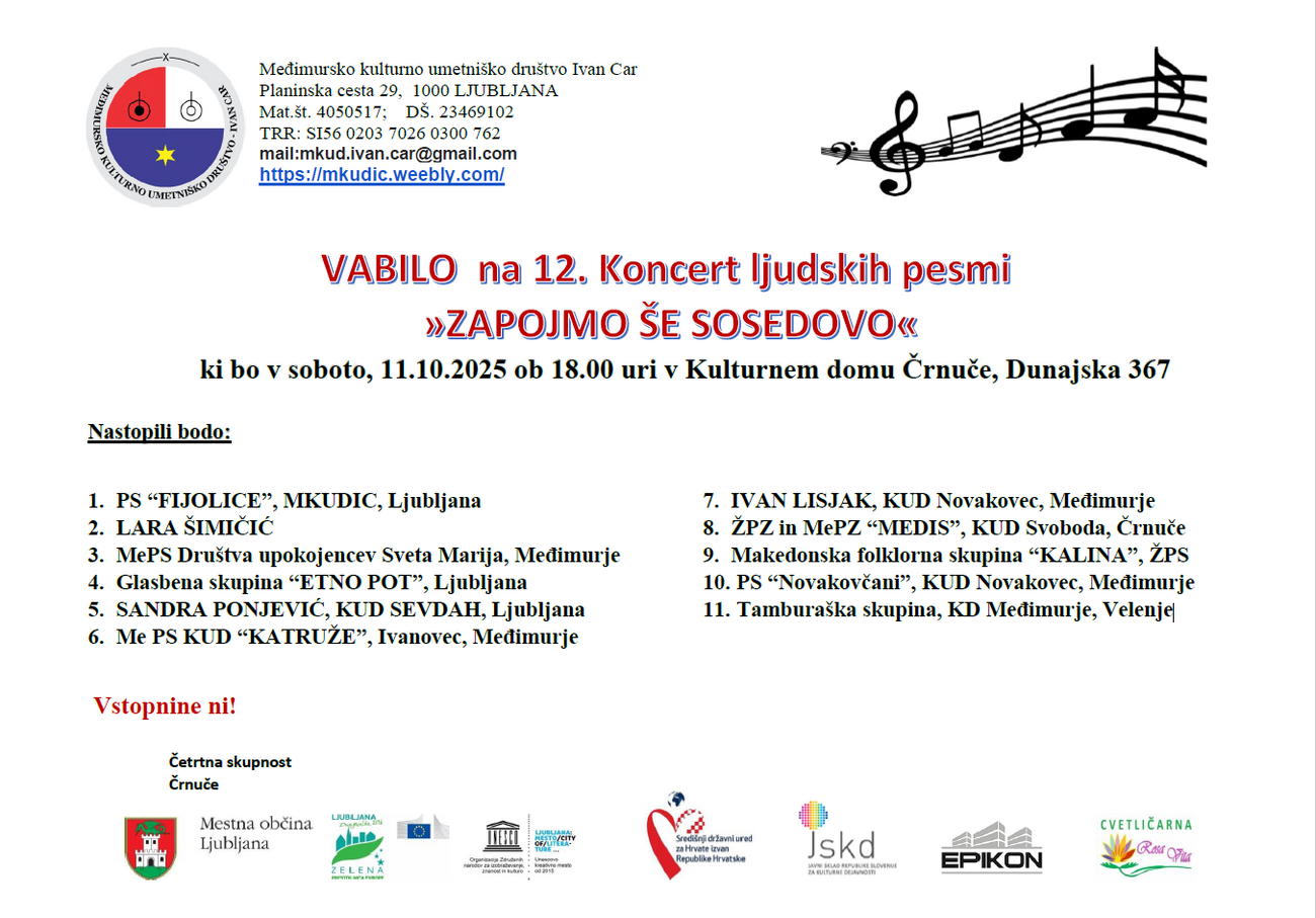 V soboto, 11. oktobra 2025, vas ob 18. uri vabimo na 12. koncert ljudskih pesmi Zapojmo še sosedovo. Dobimo se v Kulturnem domu Črnuče, Dunajska 367. Vstopnine ni.
