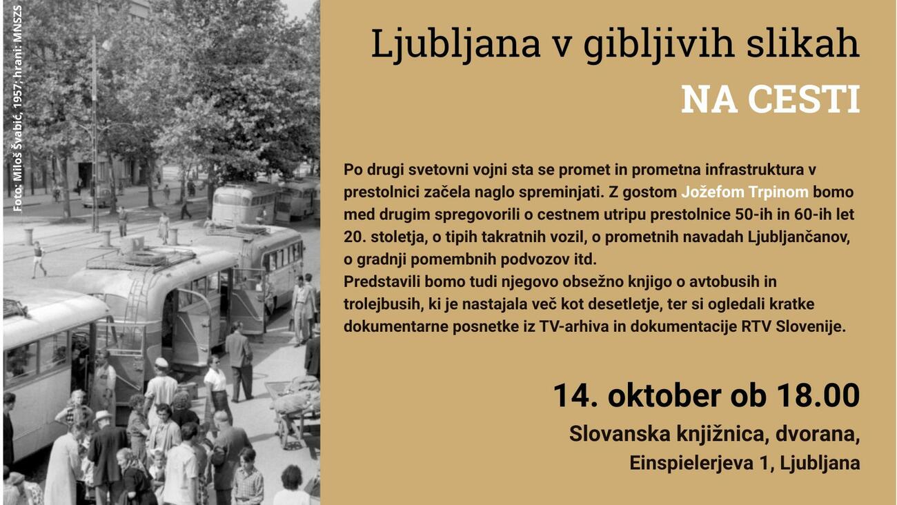 V torek, 14. oktobra, vas ob 18. uri vabimo na pogovor o razvoju ljubljanskega prometa in prometne infrastrukture po drugi svetovni vojni. Z gostom Jožefom Trpinom bomo med drugim spregovorili o cestnem utripu prestolnice v tistem času, predstavili njegovo obsežno knjigo o avtobusih in trolejbusih ter si ogledali kratke dokumentarne posnetke iz TV-arhiva in dokumentacije RTV Slovenije.